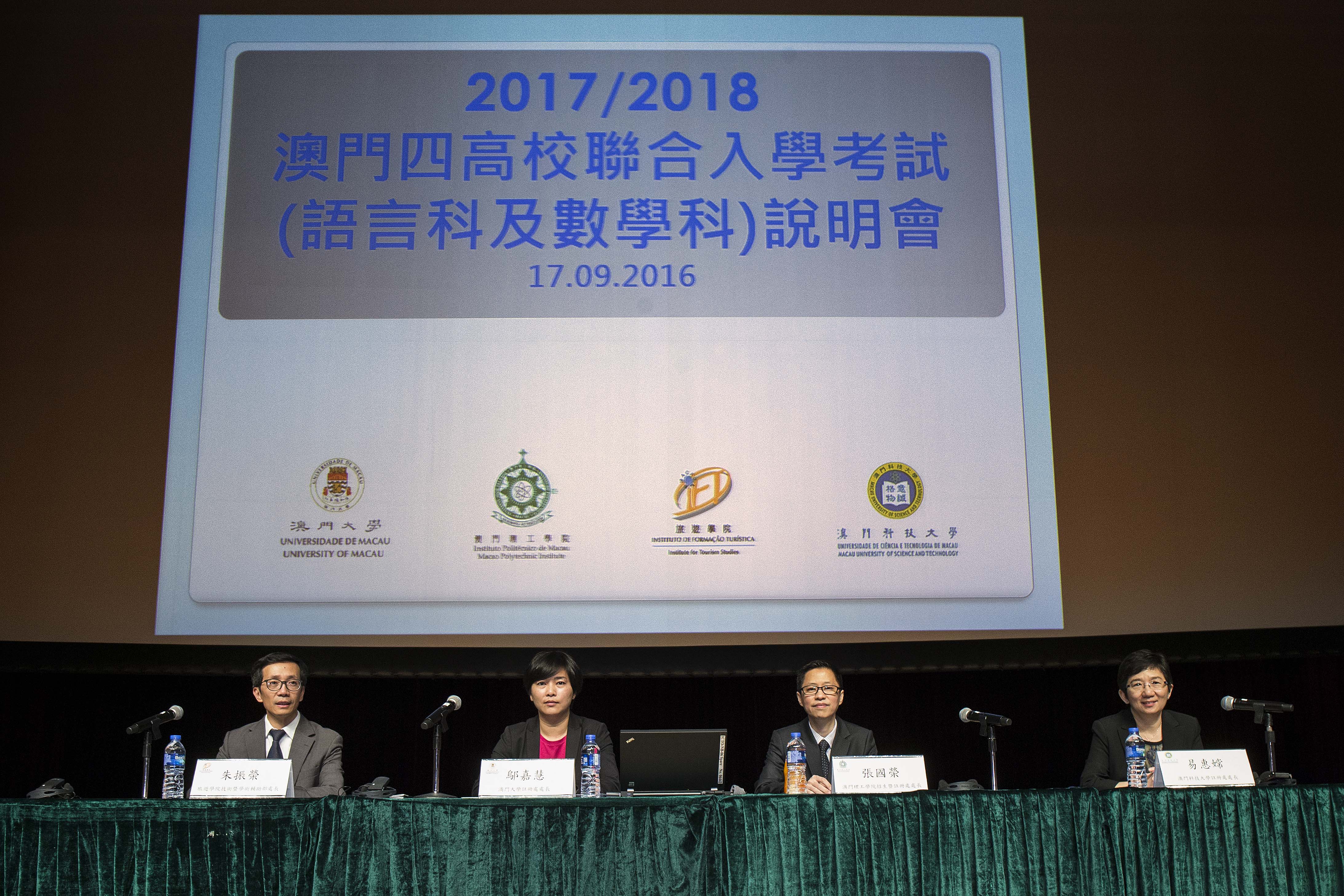澳門大學註冊處處長鄔嘉慧、澳門理工學院招生暨註冊處處長張國榮、旅遊學院技術暨學術輔助部處長朱振榮和澳門科技大學註冊處處長易惠嫦介紹聯考的考務工作,包括報名日期、報名流程、聯考科目、考試時間表、覆核聯考考試成績、四校錄取程序、身心障礙學生特別考試安排等。四校表示,聯考是指四校聯合組織中文、葡文、英文及數學四個科目的入學考試,其他科目的考試或面試,則由四校自行安排及公佈。同時強調,四校獨立招生,有意報考四校或當中任何一所院校的同學,需按過往做法,分別透過相關院校的網報系統進行報名。並且指出,聯考並非統一入學分發,考生仍可同時獲多間院校錄取而作出入學選擇;四校將根據各自課程的入學標準錄取學生。在問答環節期間,與會者較為關注評核準則、收生標準、成績發佈等方面。