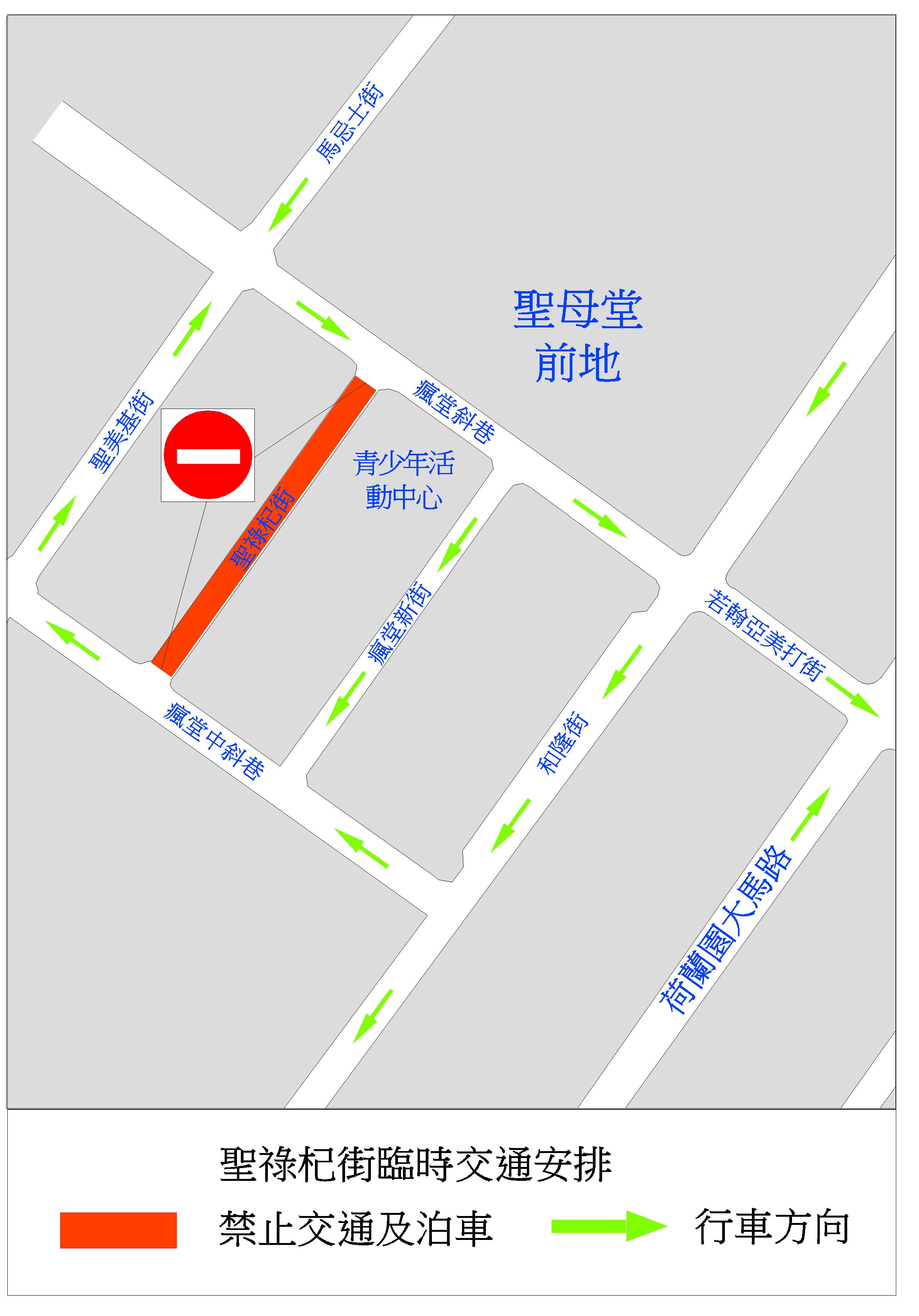 配合望德堂區創意產業促進會舉辦活動,介乎瘋堂中斜巷與瘋堂斜巷之間的一段聖祿杞街,10月1日(周六)至12月31日(周六)期間,逢周六、日下午2時至晚上9時臨時封閉交通。