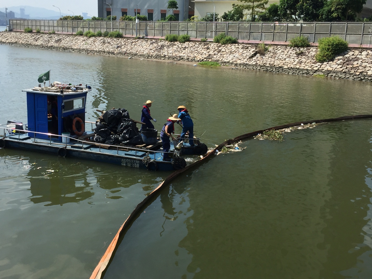 工作人員加緊清理海面死魚