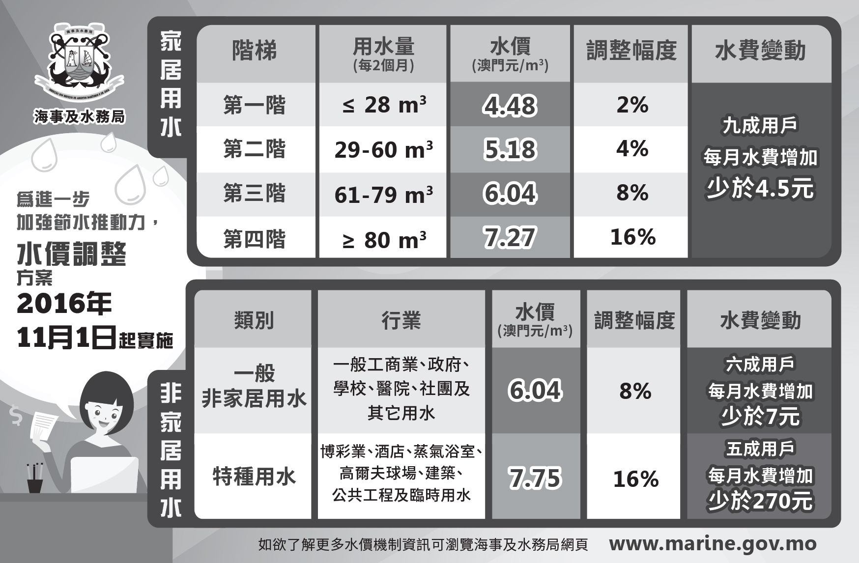 為進一步提倡社會各界節約用水、提高水價機制的節水效益,經對本澳供水全成本進行分析,以及評估各類別用戶水價的調整方案和影響後,自來水價格調整將於今年11月1日起實施。是次水費調整會繼續沿用水價機制的原有結構,並對各類別用戶的水價進行調整。(有關內容詳見附表)