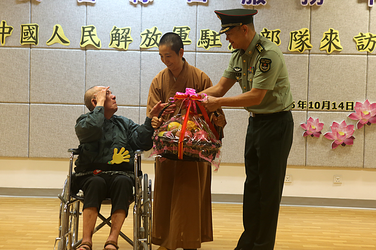 菩提社會服務管理委員會釋健釗主席致歡迎辭,高志軍副參謀長代表駐軍官兵在致辭中表示:“尊老、愛老、助老、扶老是中華民族傳統美德,駐軍作為人民子弟兵,始終牢記我軍性質宗旨,愛祖國、愛澳門,堅決維護澳門長期繁榮穩定,衷心祝願澳門明天更加美好,衷心祝願各位長者健康幸福。”