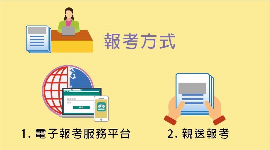 除電子報考服務平台外,可選擇親送報考方式,由投考人或他人前往水坑尾街公共行政大樓地庫一樓辦理報考手續,親送報考設有網上預約服務(http://concurso-uni.safp.gov.mo/)。辦公時間:星期一至星期四,上午9:00至下午5:45;星期五上午9:00至下午5:30,中午照常辦公。