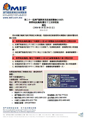 鑑於澳門地球物理暨氣象局於今(20)日上午正懸掛一號風球,顯示時颱風“海馬”逐漸接近澳門,未來將考慮是否改掛更高級別之風球,故“第二十一屆澳門國際貿易投資展覽會”(21stMIF)因應天氣變化情況,已提早準備一系列預案及措施,並積極與氣象局保持緊密聯繫,預案措施已經與來自世界各地的嘉賓、參展商溝通,大會秘書處設24小時電話諮詢服務,積極為來賓解決各項因應颱風所帶來的影響。