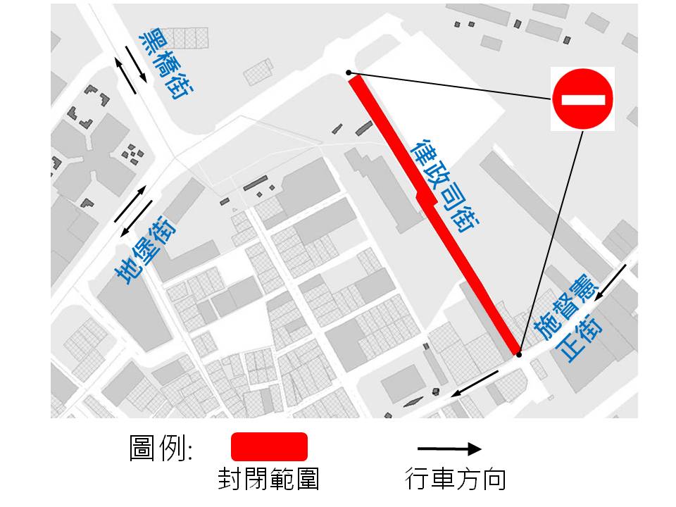 由於上述路段僅提供單線行車,且沒有供車輛迴轉的空間,有見及此,交通事務局在考量施工期間的車輛通行及附近居民的出入安全,律政司街會臨時實施封閉交通,禁止車輛駛入,直至工程結束。