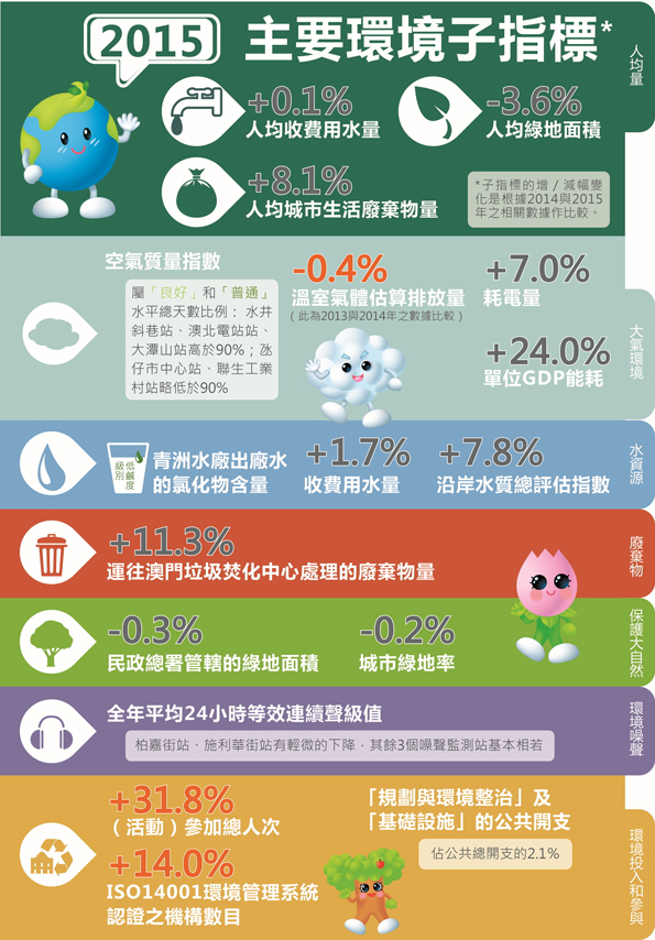 在大氣環境方面,2015年空氣監測站錄得的空氣質量屬「良好」和「普通」水平總天數比例接近九成,PM10和PM2.5年平均濃度值首次達標,符合粵港澳珠江三角洲區域空氣監測網絡所監測得到的結果,PM2.5仍是影響澳門空氣質量指數的主要污染物之一。2014年本地的部份大氣污染物估算排放量上升,溫室氣體估算排放量均較2013年減少。在用水量方面,2015年人均用水量較2014年有所增長,飲用水水質及供應方面則保持穩定,但沿岸水體水質較2014年惡化。在廢棄物方面,2015年運往澳門垃圾焚化中心處理的廢棄物量較2014年有雙位數的升幅,顯示廢棄物是澳門環境保護工作面對的一個重點議題。在保護大自然方面,2015年城市綠地率較2014年微跌。在環境噪聲方面,噪聲監測站錄得的噪聲水平與2014年基本相若,整體上澳門環境噪聲仍處於較高水平。在環境投入和參與方面,2015年政府保持一定的環境投入,而公眾關注和參與環保活動以及企業取得環境管理認證數目等較2014年有所加強。