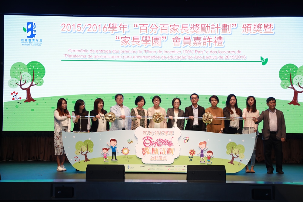 為表揚熱心及積極參與家長教育及親子活動的家長,教青局於11月6日上午10時30分假聖保祿學校禮堂舉行2015/2016學年“百分百家長獎勵計劃”頒獎暨“家長學園”會員嘉許禮。同場亦進行2016/2017學年“百分百家長獎勵計劃”啟動儀式,出席者包括教青局副局長郭小麗、郵政局副局長梁祝艷,以及30多位來自教育機構及社團的代表。