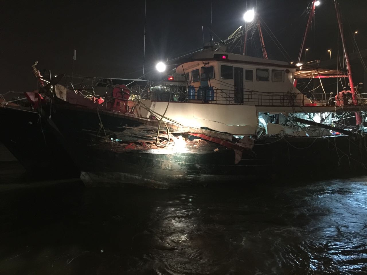 肇事沙船已駛至科學館對開海面錨泊接受調查,而肇事漁船船身左側嚴重破損,但暫沒有即時下沉危險,已由海事及水務局的拖輪拖往青洲塘停泊和接受進一步調查。