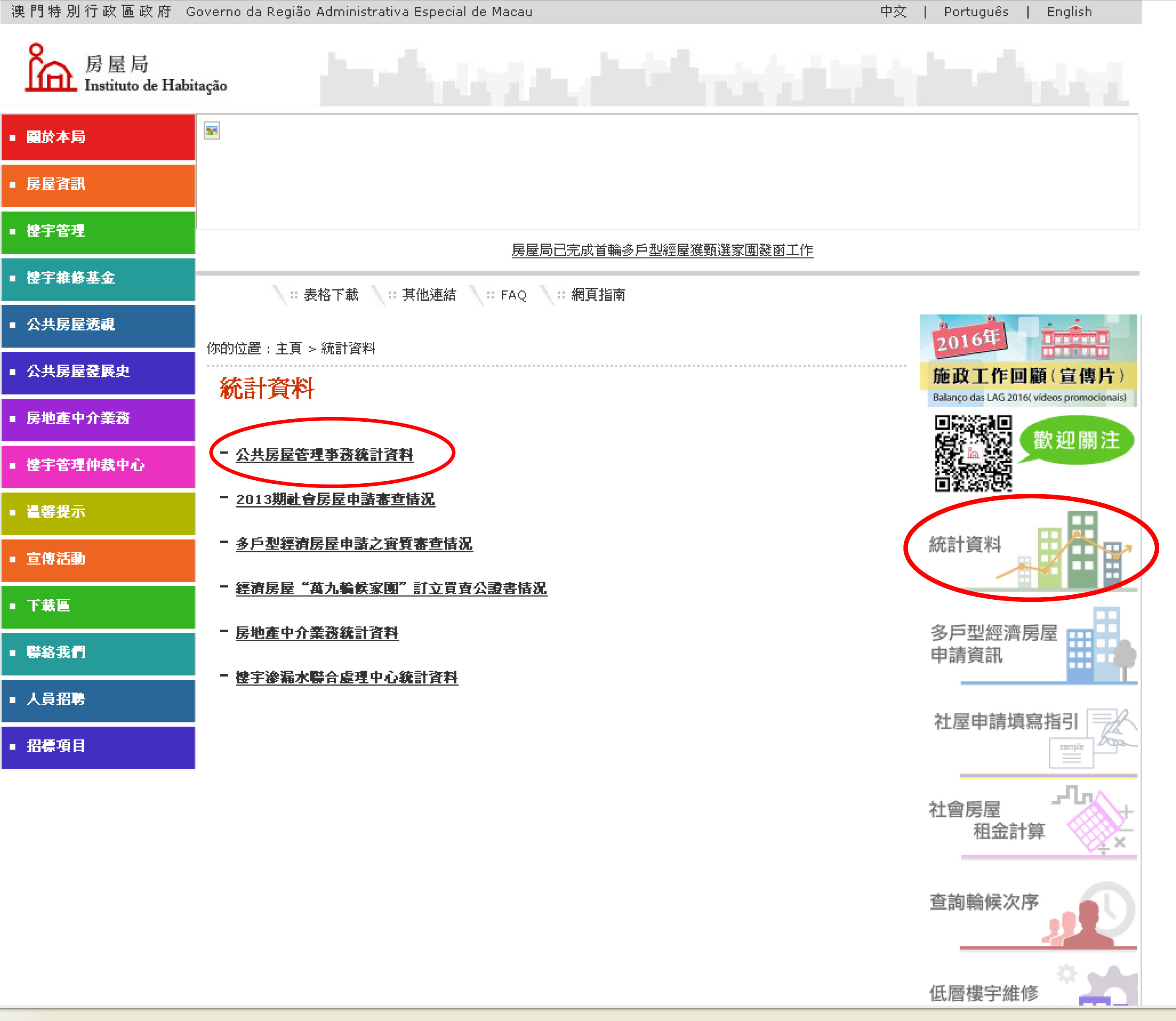 此外,房屋局已於網頁(www.ihm.gov.mo)及官方微信帳號內增設“統計資料”欄目,定期公佈“公共房屋管理事務統計資料”, 供市民查閱。