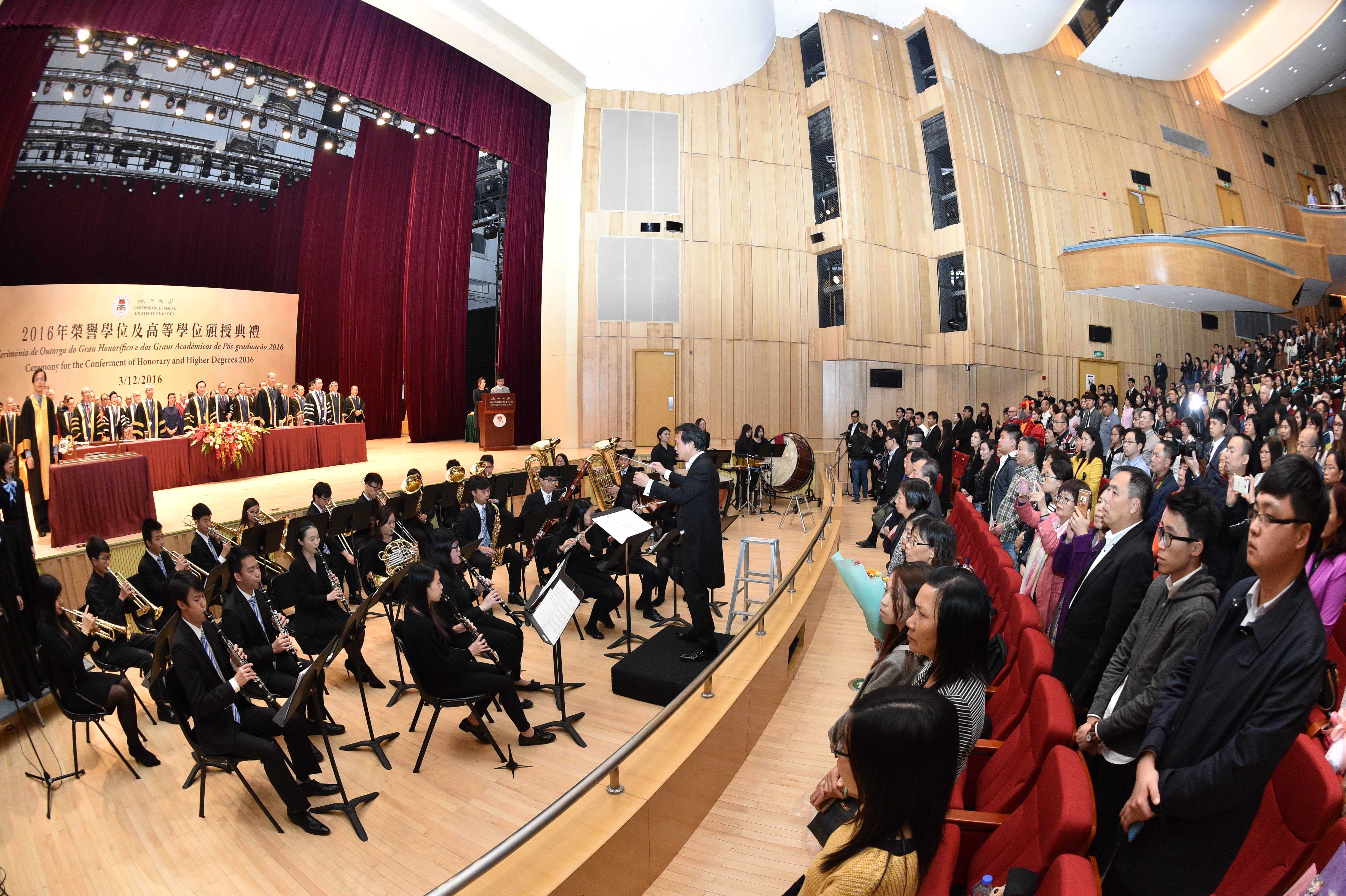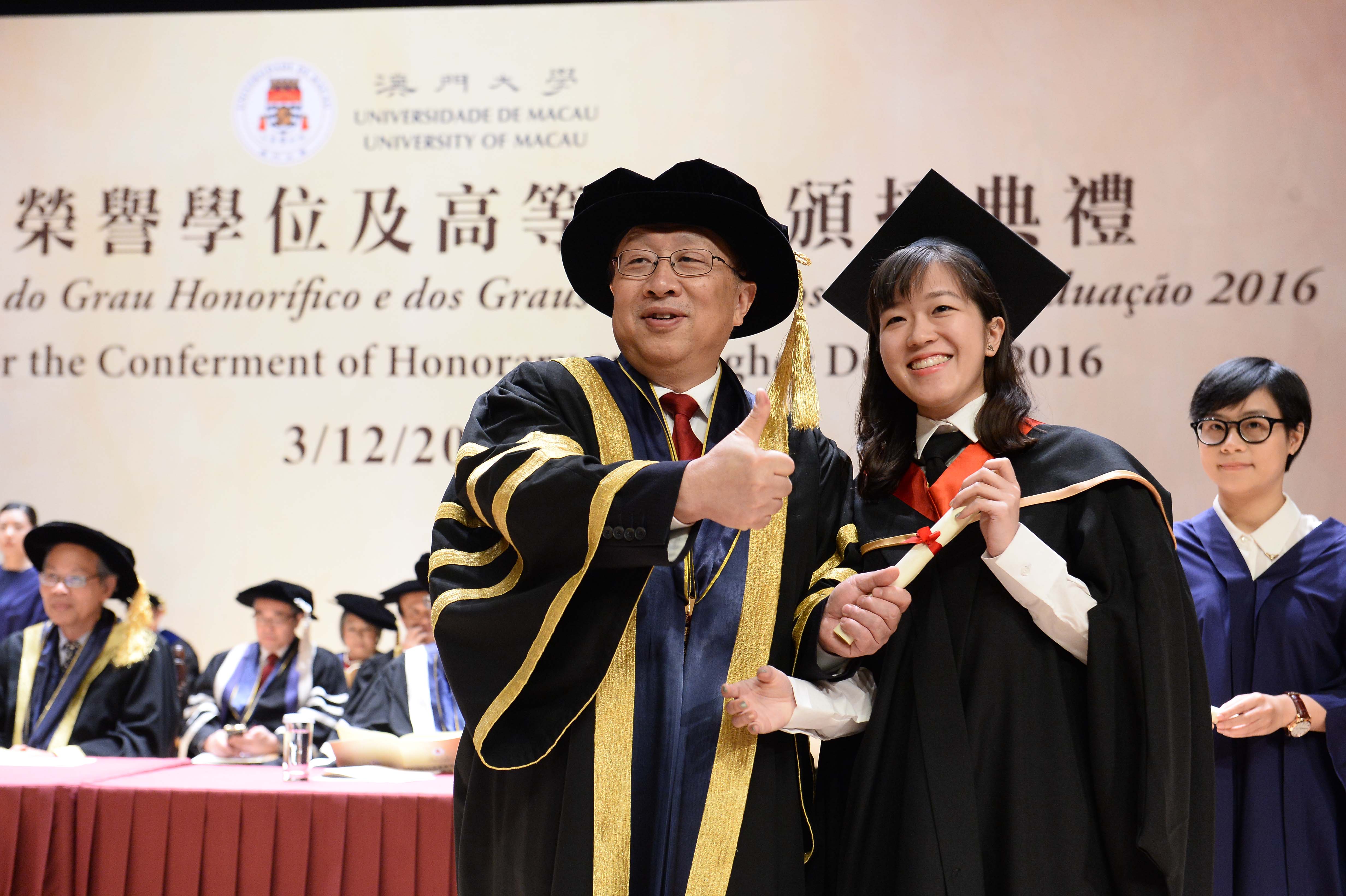 澳門大學今(3)日舉行2016榮譽學位及高等學位頒授典禮,今年有852名博士、碩士和學士後文憑/證書課程的學生頒發畢業證書。典禮由行政長官兼澳大校監崔世安代表、社會文化司司長譚俊榮博士主持,他表示,澳大教育模式有效提升澳大辦學水平,並帶動整個澳門高等教育水平的提高,他對澳大在中國與葡語國家文化交流中心作出積極配合表示讚賞。