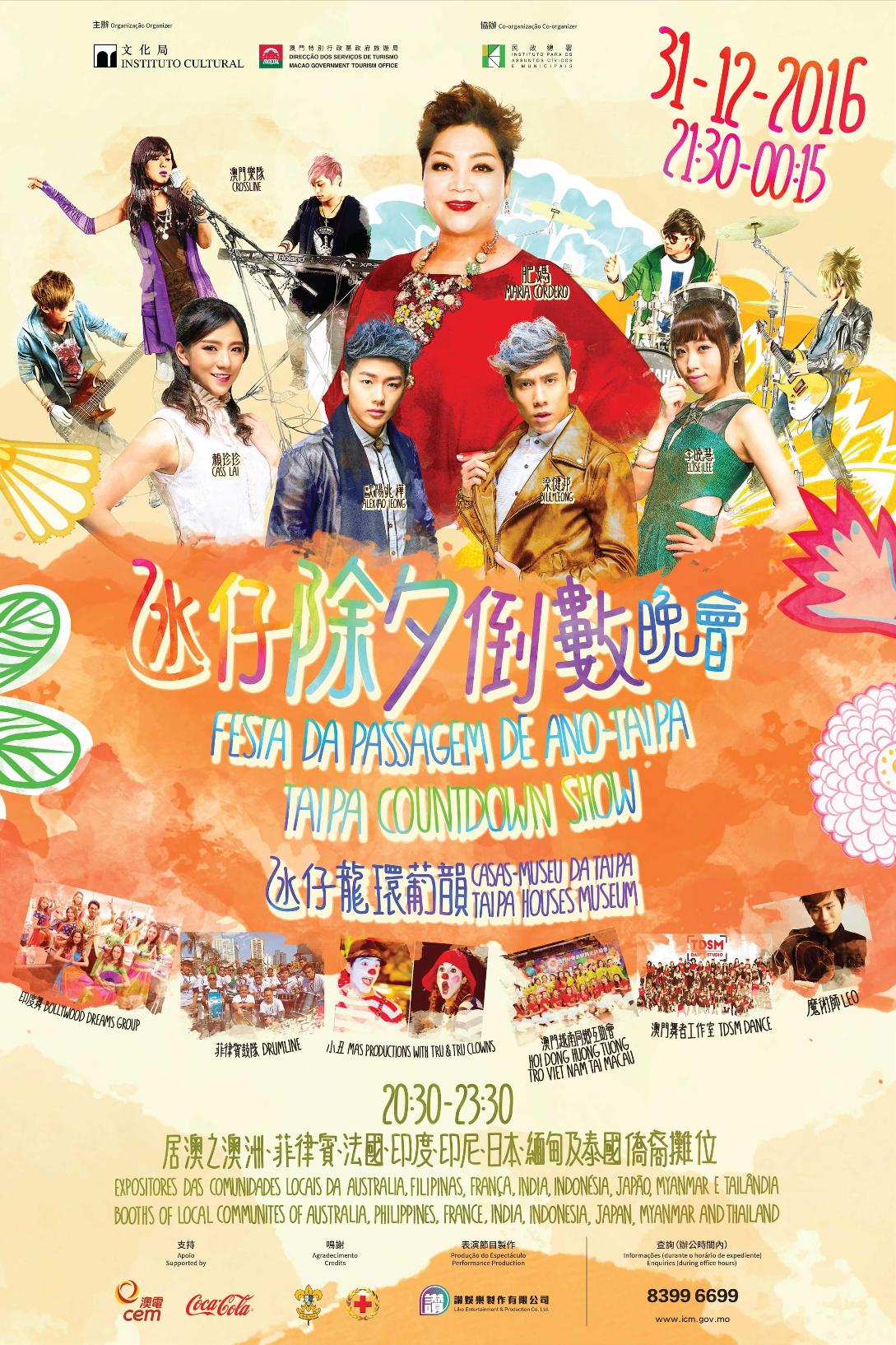 由文化局及旅遊局合辦,民政總署及澳門廣播電視股份有限公司協辦的“二零一六澳門除夕倒數演唱會”和“二零一六氹仔除夕倒數晚會”將於十二月三十一日晚上,分別在澳門西灣湖廣場和氹仔龍環葡韻舉行,為市民送上連場精彩演出,當晚更將有超過一萬發煙火在倒數完畢踏入二零一七年的一刻於旅遊塔對出海面綻放,點綴澳門夜空,迎接新年蒞臨。