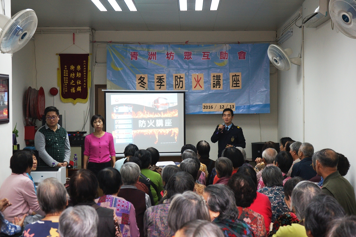 消防局分別於12月13日及15日,派出官員拜訪“青洲坊眾互助會”及“街坊總會望廈社區中心” 及為其會員舉辦防火及救護知識講座,座談中雙方就該區的消防工作進行討論並交換意見,並得到坊會義工的協助在區內一帶派發防火宣傳品。