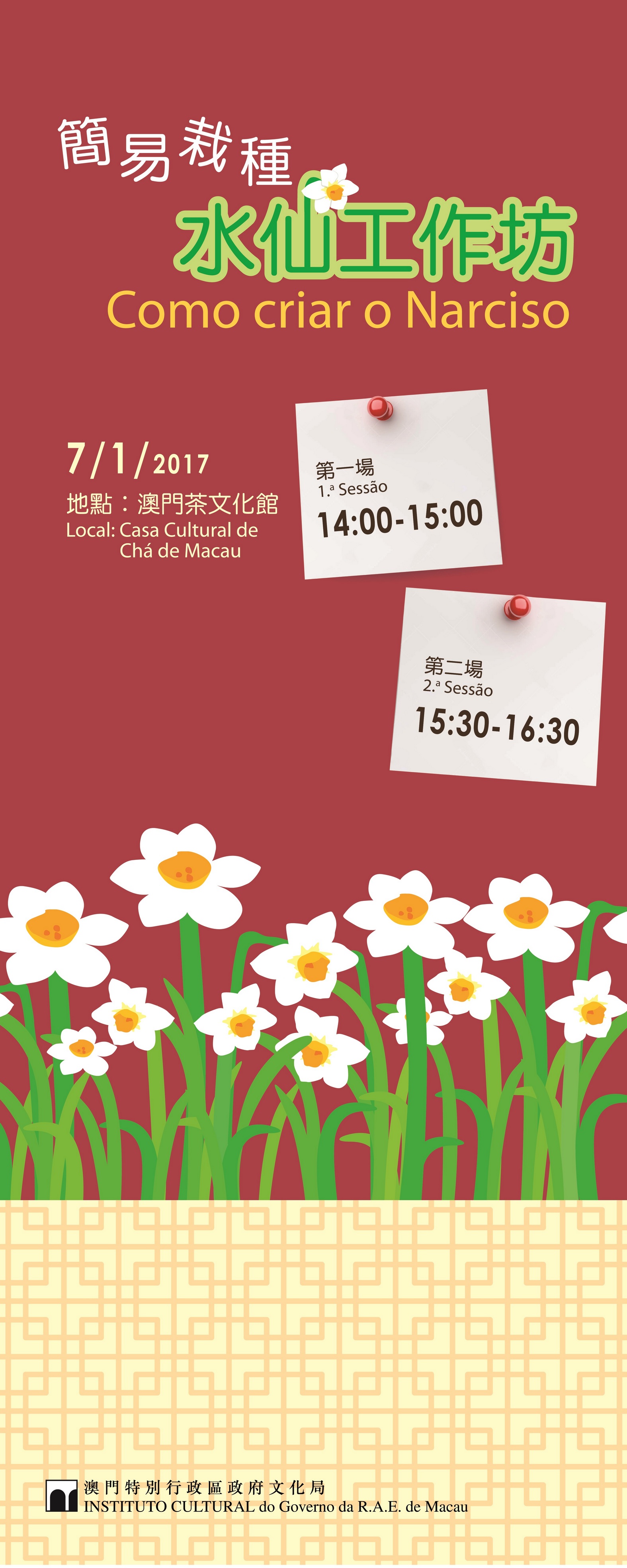 是次工作坊由文化局資深工作人員教導,與市民分享培養水仙花的心得,工作坊內容包括:如何選購水仙花頭、在水仙花頭哪個部分切割最理想和日照所需時間等,並將作現場示範。工作坊費用全免,主辦方將提供每位參加者水仙花頭一個和借予刀具操作,一月七日下午共設兩場,分別為下午二時及三時半,每場約一小時,歡迎十二歲或以上的市民報名參加,名額有限,先到先得。有興趣報名市民請於辦公時間內致電伍小姐,電話八九八八四一二七。