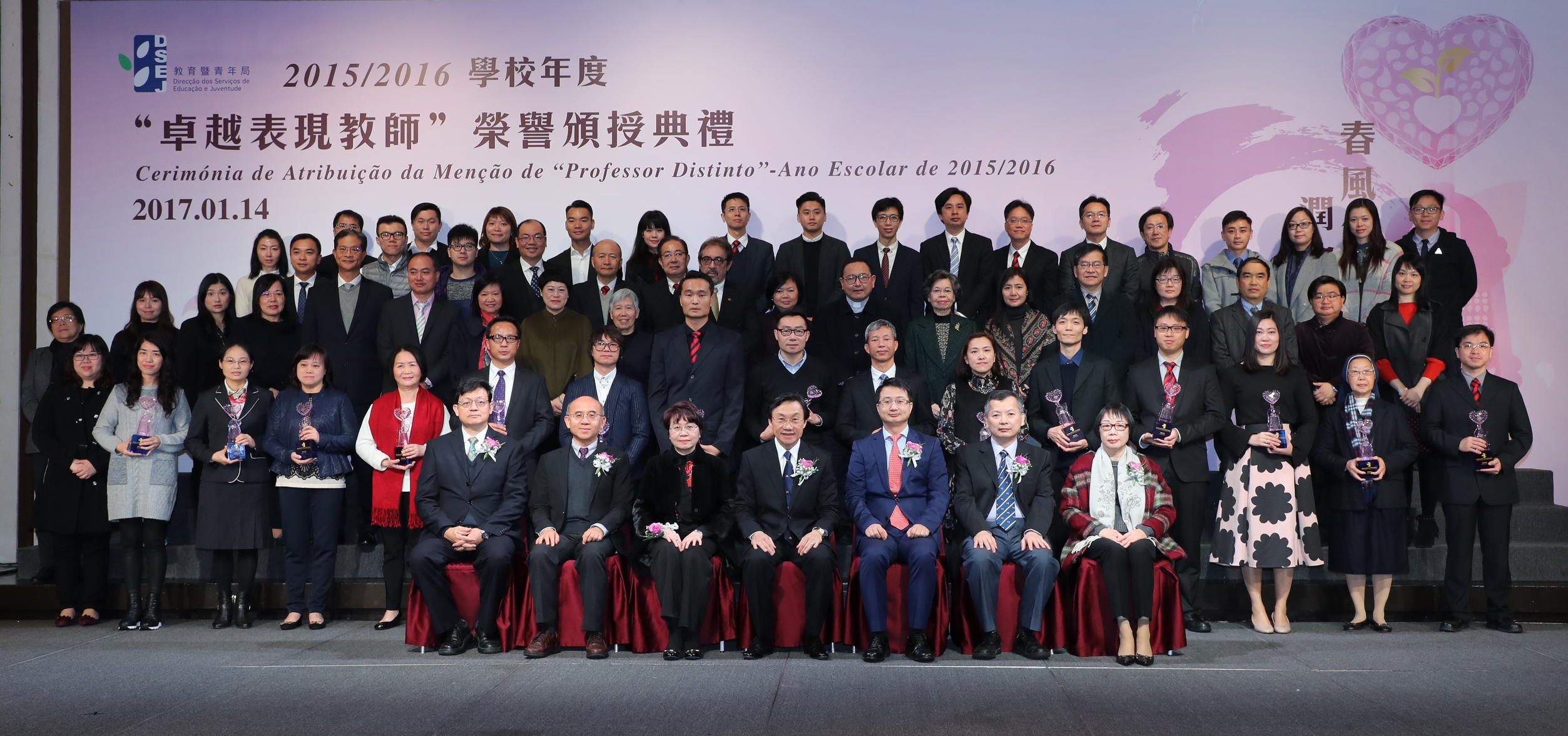 為繼續促進教育界追求卓越教育的精神與凝聚良師的動力,教育暨青年局於2017114日假澳門旅遊塔會展娛樂中心舉行2015/2016學校年度“卓越表現教師”榮譽頒授典禮,以表彰該學校年度具卓越表現的15名教師。典禮由社會文化司司長譚俊榮主持並向卓越教師頒授榮譽;其他主禮嘉賓包括中央人民政府駐澳門特別行政區聯絡辦公室文化教育部副部長浦海龍,教青局局長、教學人員專業委員會主席梁勵,教學人員專業委員會副主席鄭振偉,“卓越表現教師”榮譽評審專家小組主席范息濤、教青局副局長老柏生、郭小麗。出席典禮的嘉賓還包括非高等教育委員會委員、青年事務委員會委員、教學人員專業委員會委員、“卓越表現教師”評審專家小組成員、學校領導及教師、獲頒授榮譽的教師及其親友等共約360人。