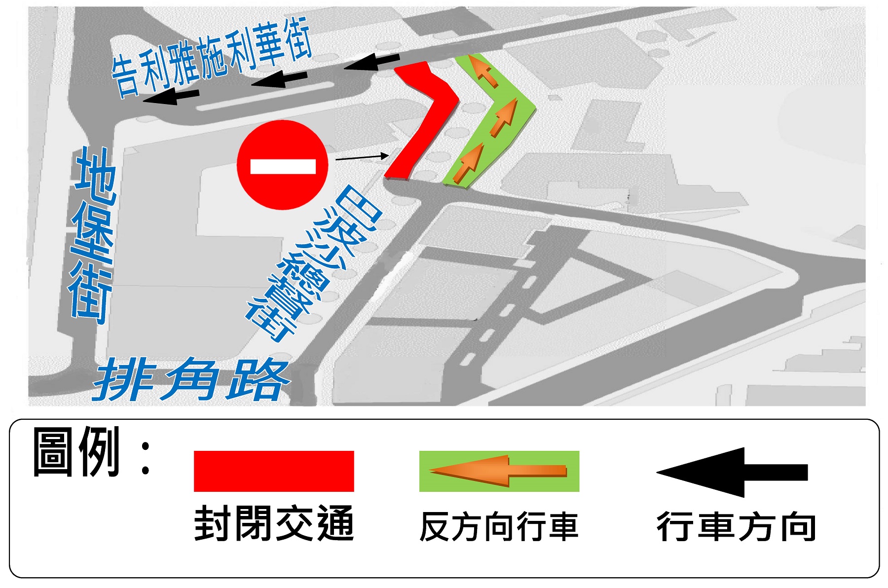 交通事務局呼籲駕駛者留意,並遵守路上設置之臨時交通標誌,小心駕駛。