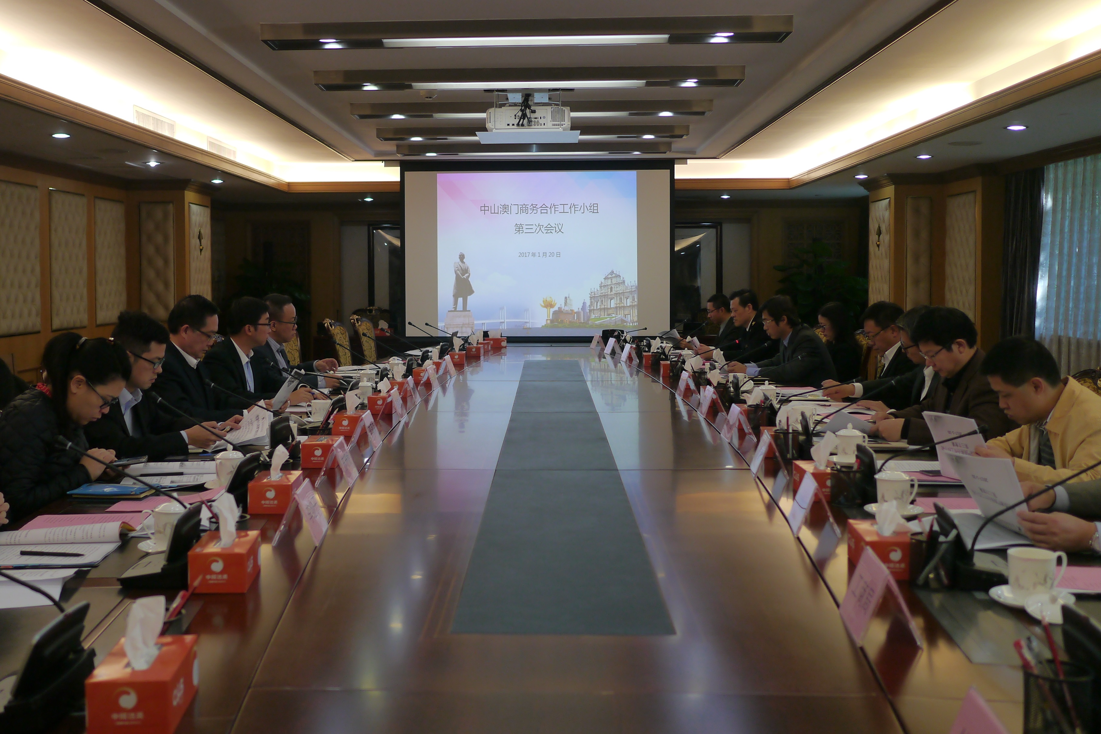 澳門貿易投資促進局主席、商務合作工作小組澳門方組長張祖榮率領一行7人,於1月20日到中山,與中山市人民政府副市長、商務合作工作小組中山方代表領導雷岳龍,進行中山與澳門商務合作工作小組會議,議程主要總結2016年度中山與澳門在商務合作方面的工作、探討及交流2017年工作計劃及完善兩地商務合作發展方式等。
