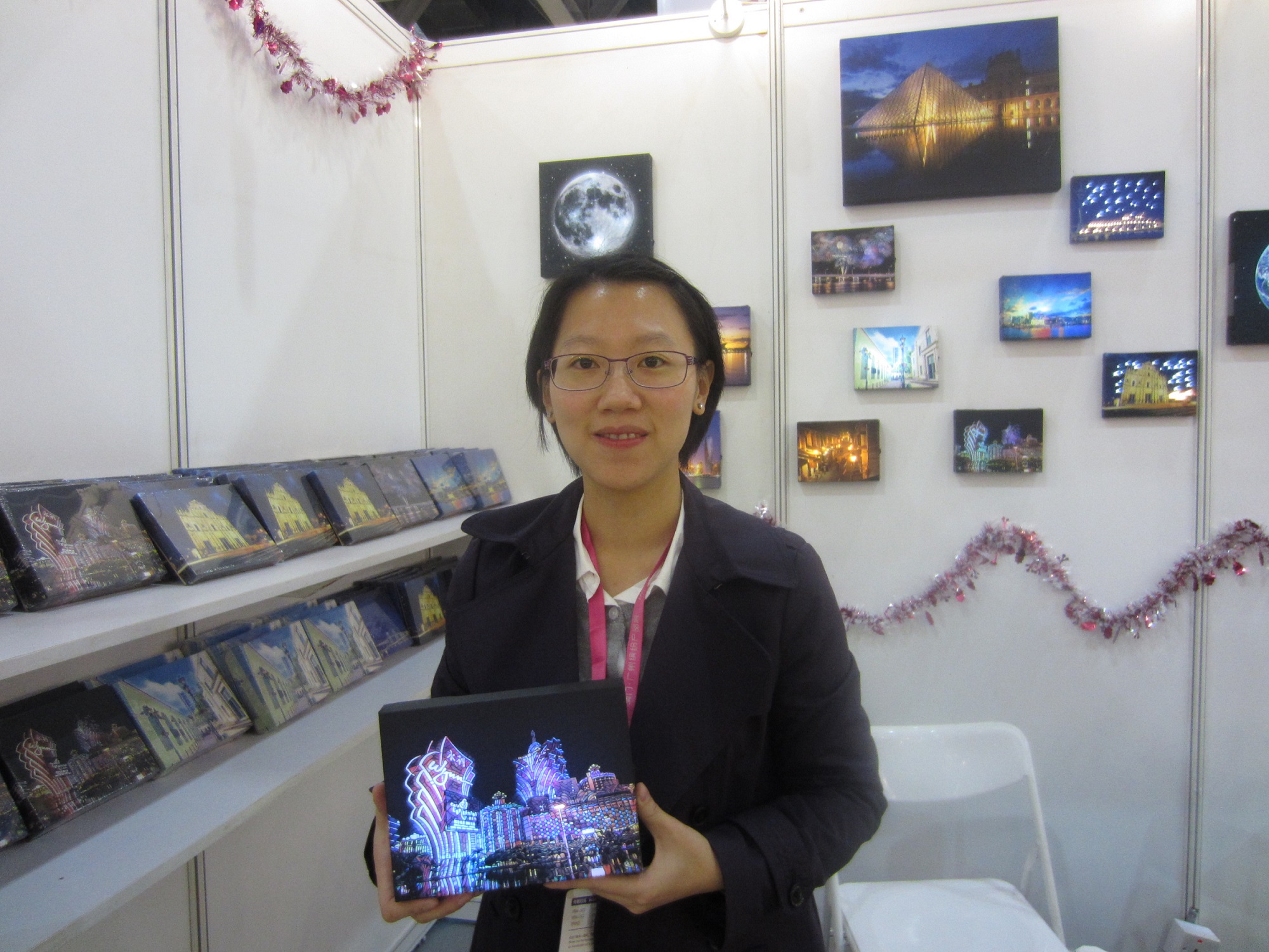 “澳門•廣州繽紛產品展”自2012年起舉辦,至今踏入第6年。是次首次參展的星門科技(澳門)有限公司銷售顧問謝碧詩表示,公司主要售賣電子技術。近年留意到澳門文創紀念品市場暫時缺乏一些科技元素的產品,所以就以澳門的景色與科技元素相結合製成產品。藉著是次展會,抱著“試水溫”心態測試廣州市場,認為是難得的經驗,有助公司更清晰了解自身銷售市場,為未來營銷策略做好準備。