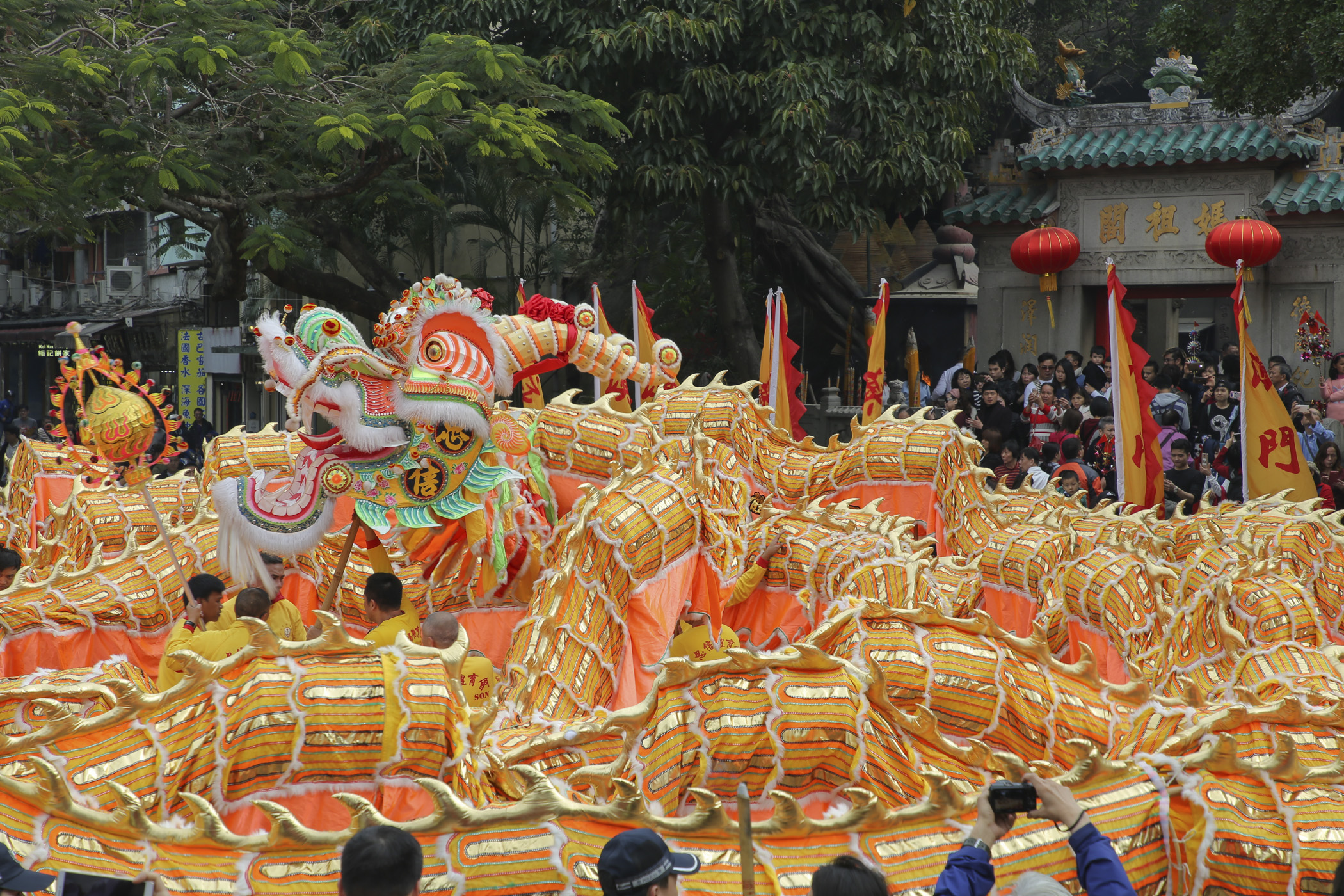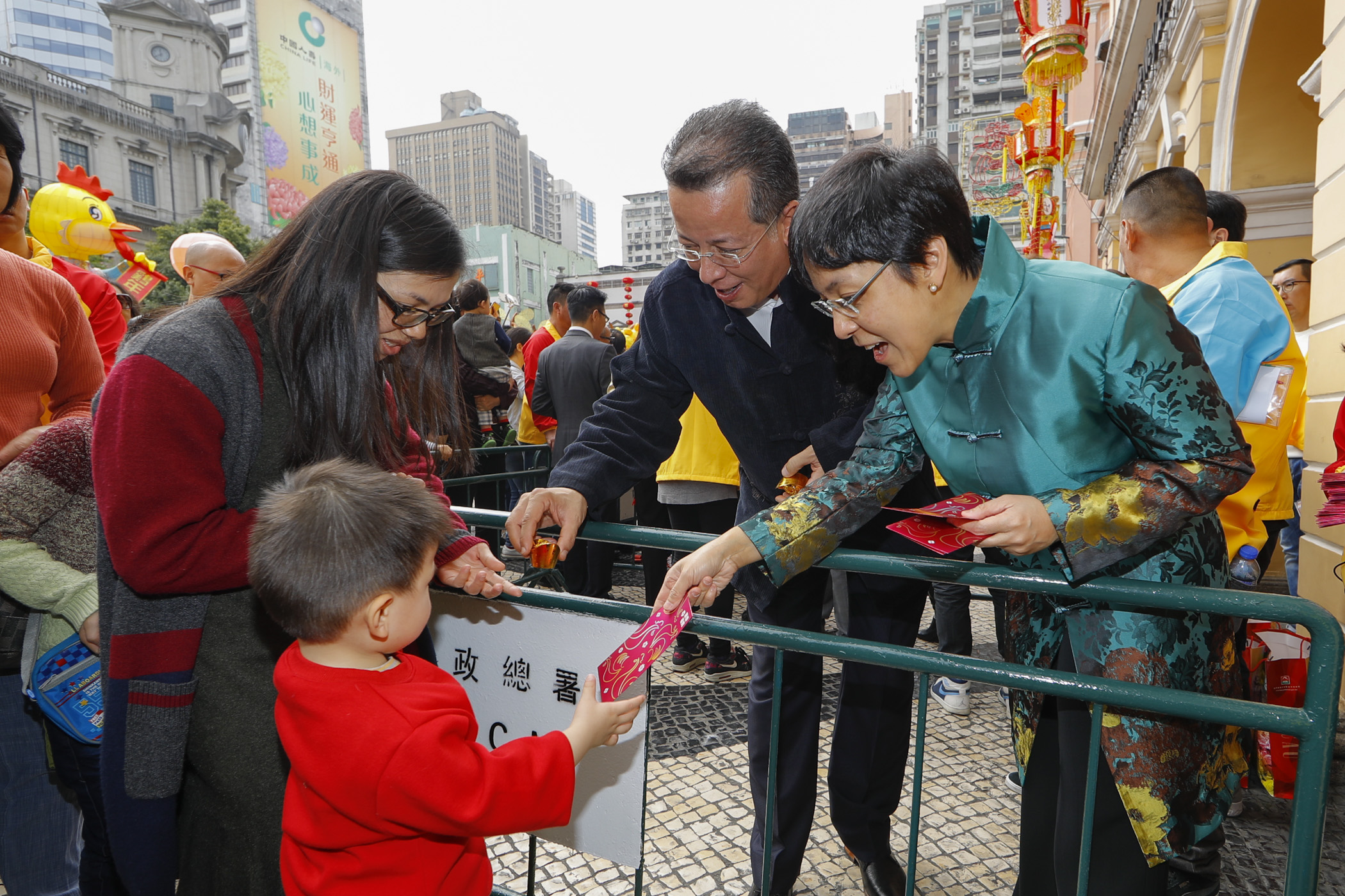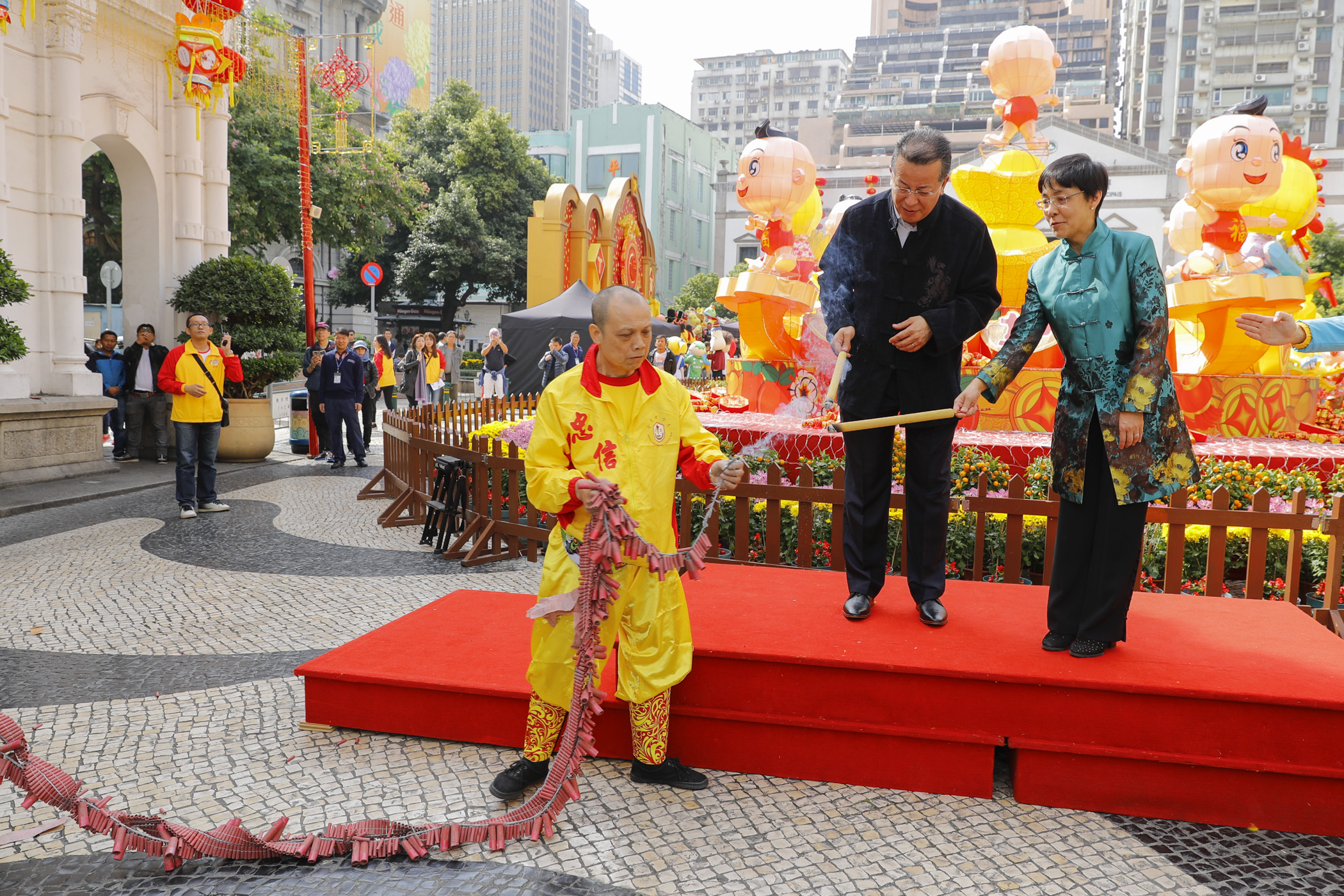 旅遊局局長文綺華、民政總署管理委員會主席戴祖義、旅遊局副局長謝慶茜及程衛東,以及業界代表等,於大年初一早上在大三巴牌坊廣場主持金龍和醒獅點睛儀式,又於議事亭前地燃放炮竹;之後,嘉賓們聯同財神爺在議事亭前地向市民和旅客派“利是”和金元寶,現場喜氣洋洋,祝福聲連連,尤其在財神爺手中接過“利是”,取其好意,祝願澳門繁榮興旺、財源廣進。