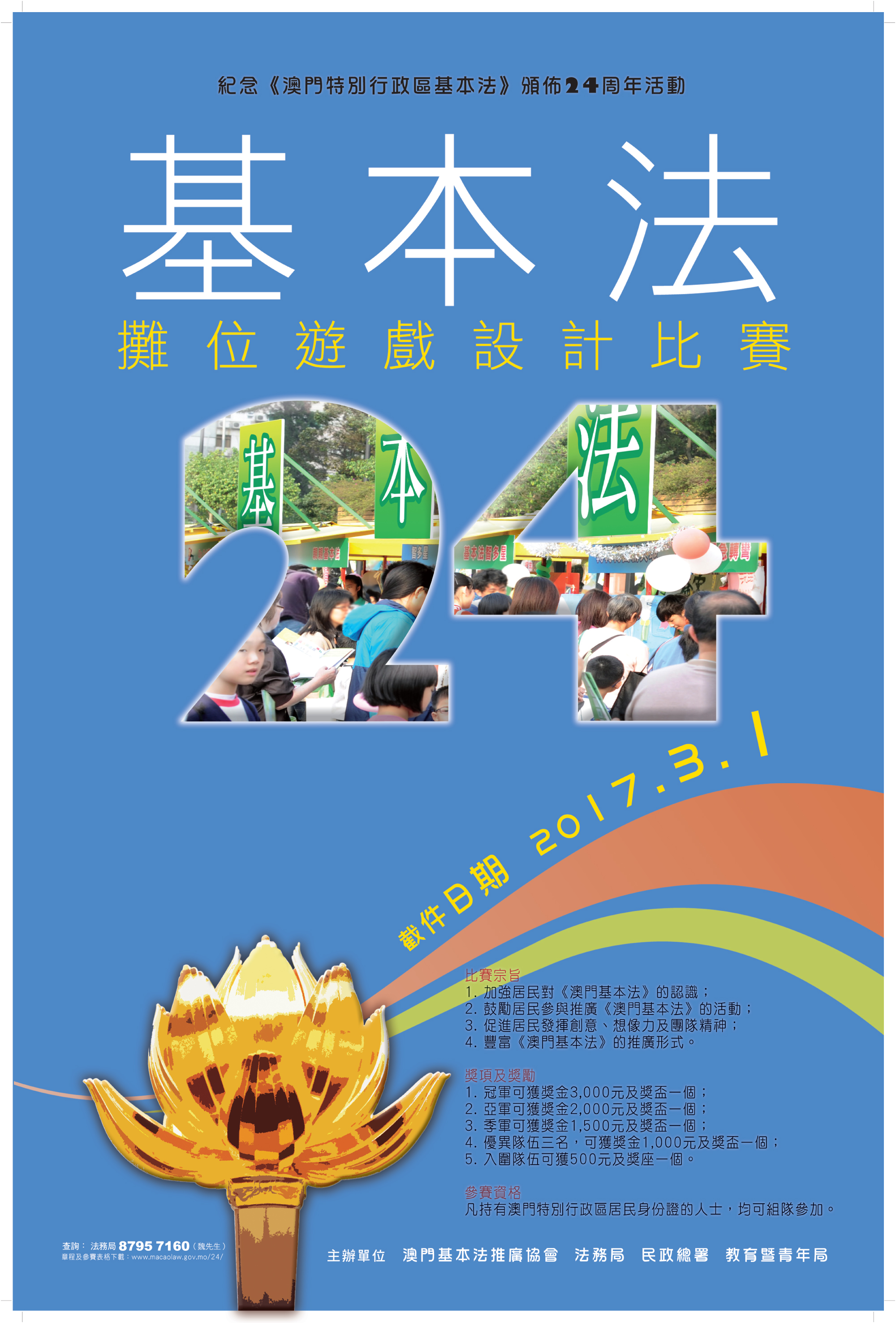 為迎接《澳門特別行政區基本法》頒佈二十四周年的到來,澳門基本法推廣協會、法務局、民政總署及教育暨青年局共同舉辦系列慶祝活動,當中的基本法攤位遊戲設計比賽,目的是讓全澳市民共同參與,一起學習和推廣《基本法》。比賽已接受報名,並將於三月一日截件,有興趣參加的市民應把握時間從速報名。