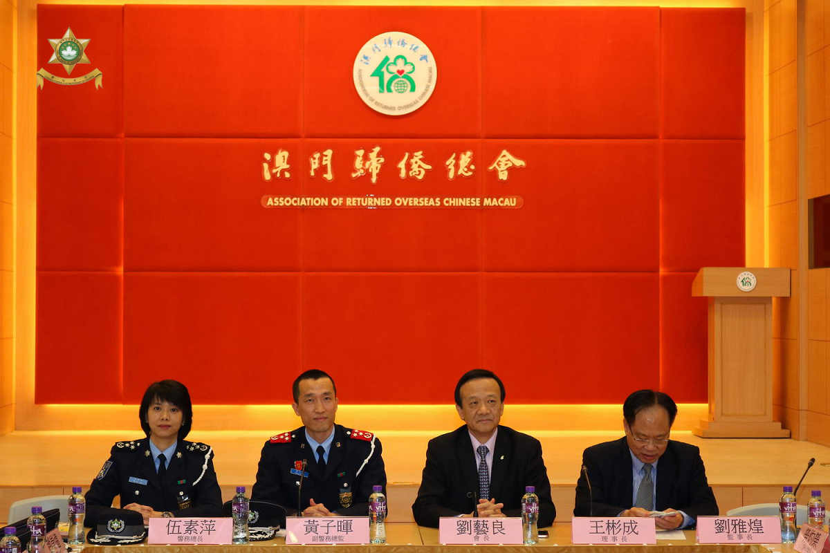 當日下午四時,由治安警察局一行十人,在副局長黃子暉副警務總監、行動廳廳長伍素萍警務總長及公共關係處處長趙崇遠副警務總長帶領下,到訪澳門歸僑總會,受到澳門歸僑總會會長劉藝良、理事長王彬成等代表親切接待。