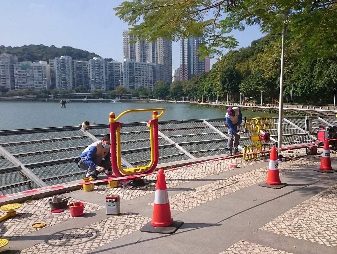 水塘休憩區已成為市民大眾進行運動及休閒活動的熱門地點,隨著使用率增加,休憩區的部分設施難免出現耗損或損壞的情況。民署早前對休憩區內的各項設施進行一系列維修及翻新,包括翻新兒童遊樂區設施組合、金屬鐵柱、涼亭等,打磨及清潔原有的油漆、按照原有或指定顏色塗抹油漆;並翻新休憩區內木椅油漆,以及各類型之健身器材,清除鏽蝕及原有的油漆、塗上防鏽漆。另外,健身器材的使用說明牌亦一併翻新。
