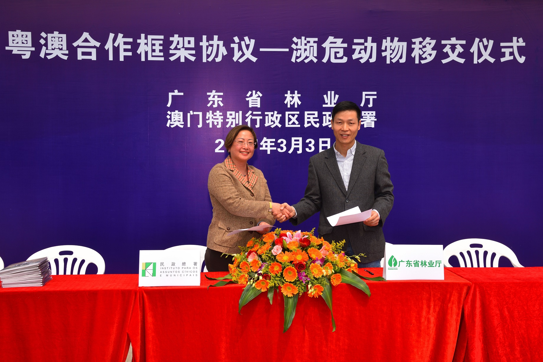 有關移交動物儀式於三月三日“世界野生動植物日"舉行,民署園林綠化部張素梅部長及廣東省野生動物救護中心鄧燕忠主任於橫琴蓮花口岸簽署文件並見證動物的順利移交,藉此宣揚保育瀕危野生動植物的重要性。廣東省野生動物救護中心為廣東省林業廳轄下正處級事業單位,主要負責廣東省野生動物的救治、馴養繁殖,能為此批接管的瀕危動物提供更良好的棲息環境。
