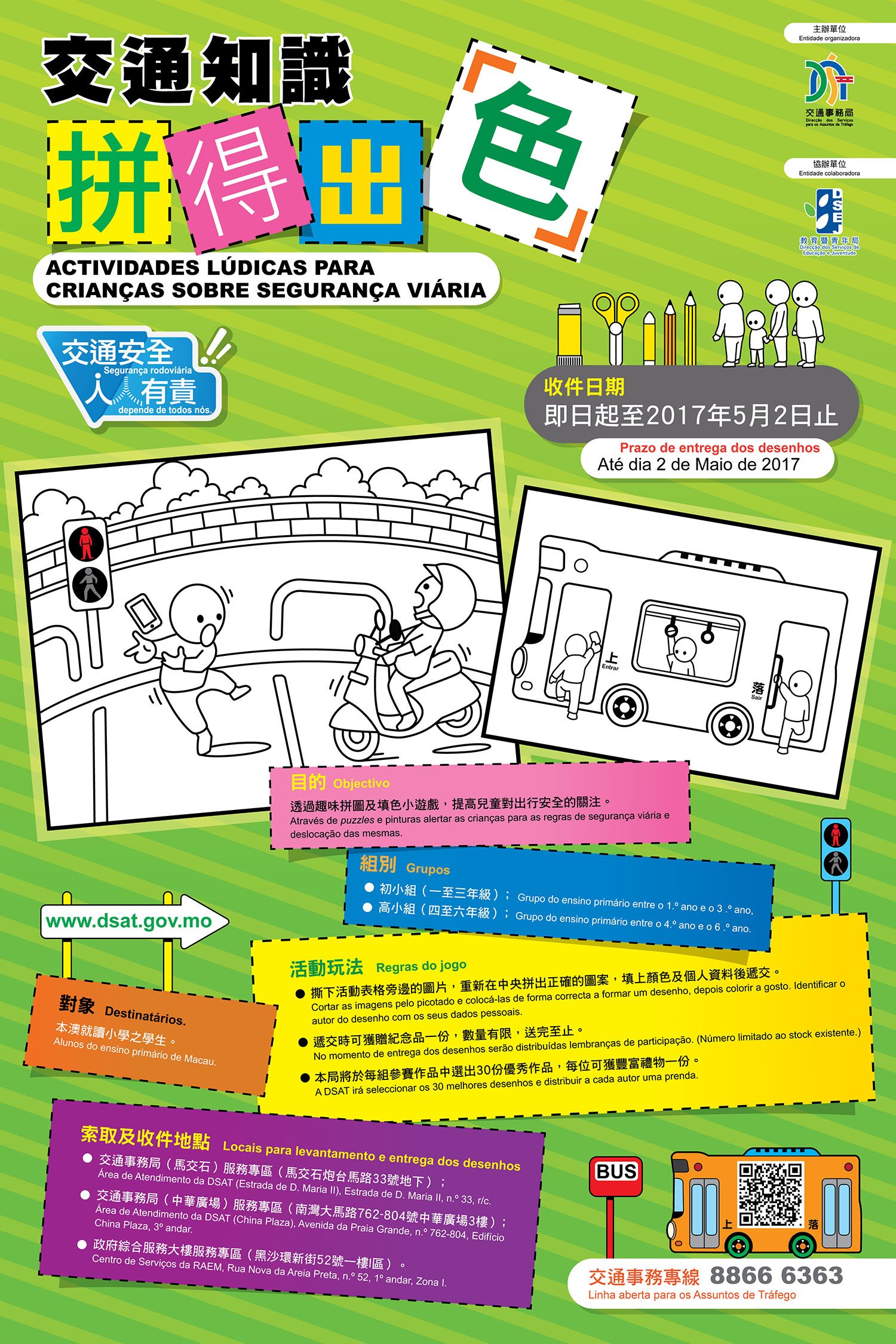 由交通事務局主辦、教育暨青年局協辦的「交通知識 拼得出色」活動即日推出,歡迎本澳小學生參加,活動分幼小組(小一至小三)及高小組(小四至小六),參加者只需拼出完整圖案並加以填色後交回,便可獲紀念品一份,及後主辦單位會於每組選出優秀作品30份以示加獎。活動表格可於交通事務局服務專區索取,5月2日截止。