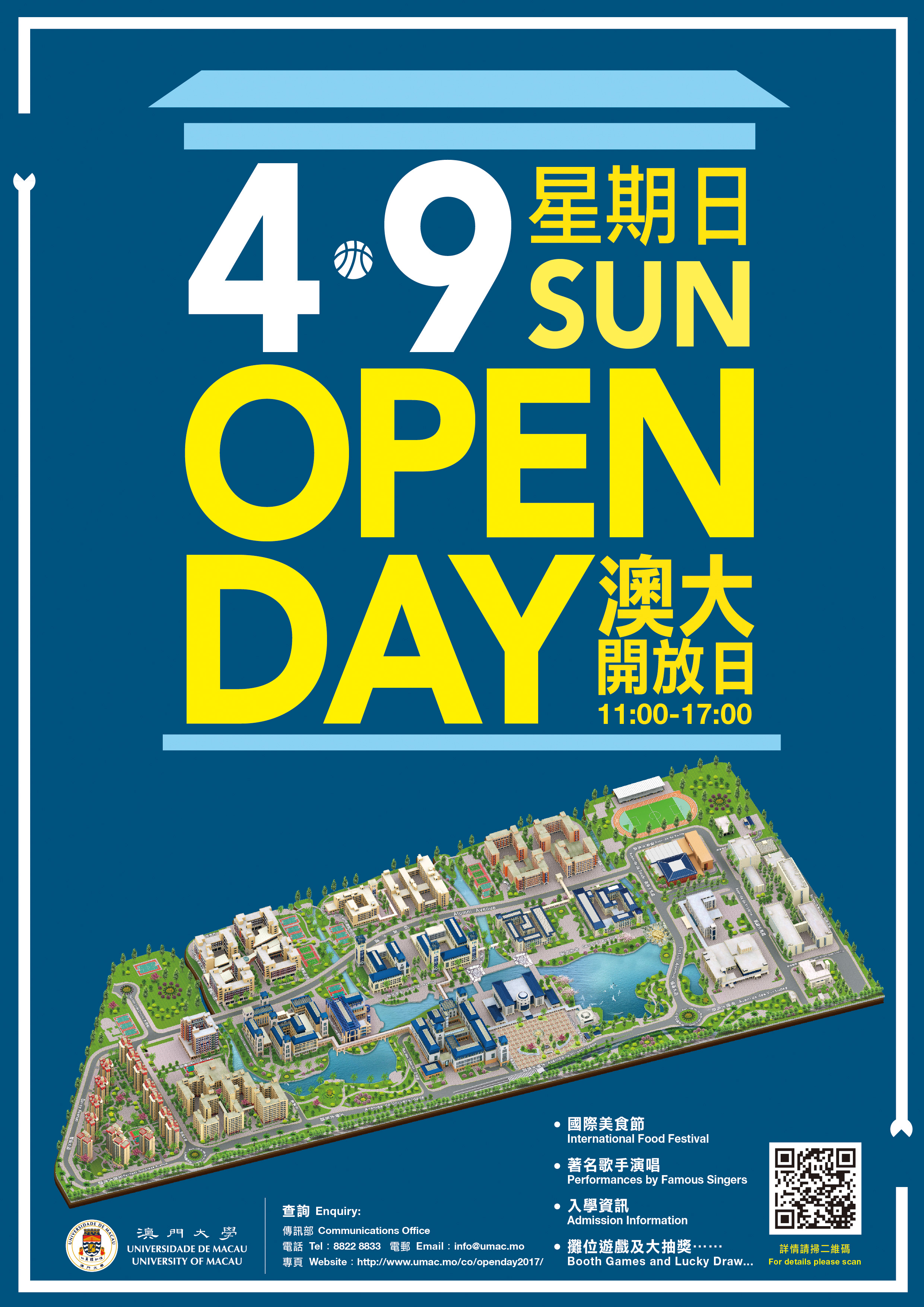 澳門大學將於4月9日(星期日)舉辦大型開放日,屆時將可欣賞國際學生大巡遊、諮詢入學訊息、玩攤位遊戲、聽澳門著名歌手澳大校友龍世傑和蘇耀光演唱,還可品嘗國際學生烹調的世界美食,一系列豐富多彩的節目讓大家深入感受澳大的校園生活。歡迎全澳市民參加,度過愉快週日。