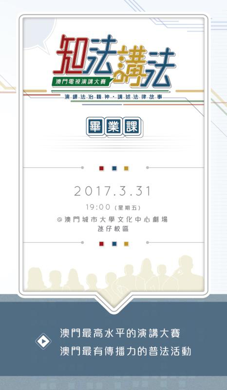 由特區政府行政法務範疇和蓮花衛視合辦的「知法講法——澳門電視演講大賽」,將於三月三十一日(周五)晚上七時假澳門城市大學(氹仔校區)文化中心劇場舉行總決賽。決賽將面向公眾開放,歡迎市民前來出席,親身觀看參賽者與普法主題完美結合的演講。
