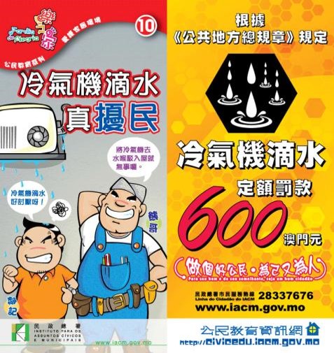 根據《公共地方總規章》規定,冷氣機滴水可被罰款澳門幣六百元。民署呼籲全澳市民在使用冷氣機前,應先確保冷氣機排水喉管已妥善接駁,同時亦要檢查排水喉有否鬆脫、破裂以及老化等,並按實際情況聘請專業冷氣技工維修,以免因冷氣機滴水被檢控。