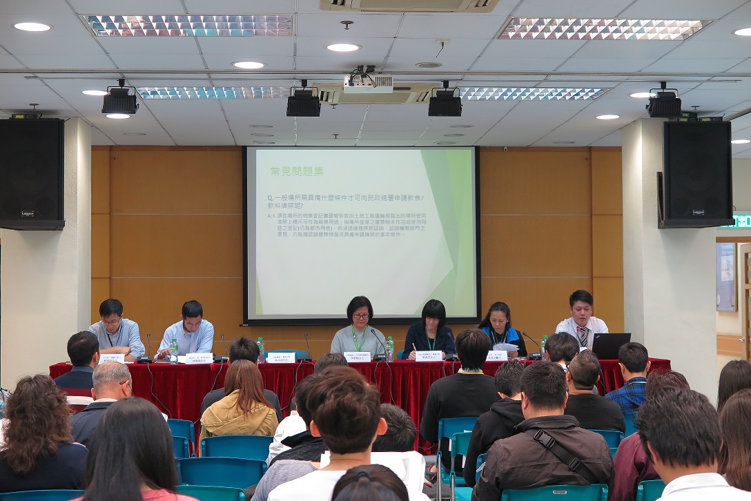 講解會於三月二十八日下午三時在營地活動中心舉行,出席的業界代表共七十五位。除民署轄下參與發牌的部門負責講解申請牌照程序中常見的問題外,亦邀請了土地工務運輸局、消防局、衛生局、文化局、勞工事務局、環境保護局及旅遊局等部門,講解處理牌照程序中各專責範疇的要求及常見問題,例如:場所閣樓如作顧客區或廚房,須符合一定的規格;禁止佔用樓宇的共同部份;申請人須查明場所有否存在僭建物,並應向當局申請拆除,否則須負上清拆的責任;消防系統設計圖必須與場所內的設置相同;通風及廢水排污等設施須符合一定要求,避免造成氣體中毒事故;確保場所有關環境衛生、機械及煮食等設施須合符標準及正常運作,並須遵守現行的法律法規等。會後設答問環節,與會者就申辦牌照時遇到的問題與講者交流意見,氣氛熱烈。
