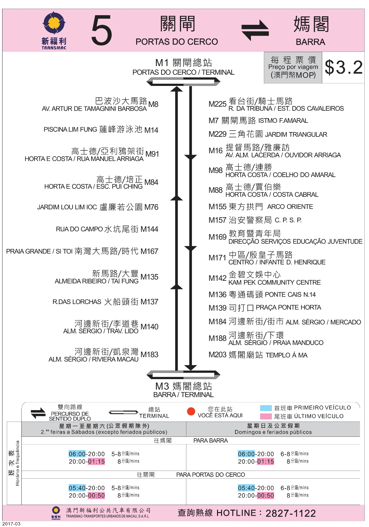 同步,7、12、19及22路線取消停靠“望廈體育館"站,乘客可轉往“望賢樓”站搭乘上述路線;2、6A、7、12、19、28C路線亦不停靠“祐漢第二街"站,改停靠長壽大馬路新增的“長壽大馬路/勝意樓"站,以減低上述路線的繞路情況。5路線則改為經高士德大馬路往媽閣,即5路線按原線行駛至“三角花園”站後,改停靠“提督馬路/雅廉訪"站、“高士德/連勝"站、“高士德/賈伯樂"站,至“東方拱門"站後按原線行駛,不停靠“市政狗房"站、“望廈炮台"站、愉景花園"站及“羅理基/馬六甲街"站。若市民須由新橋區或三盞燈一帶前往媽閣,可於高士德大馬路搭乘5路線;而中區往媽閣則可於“中區/殷皇子馬路"站搭乘2、5、10、10A、11或21A路線。
