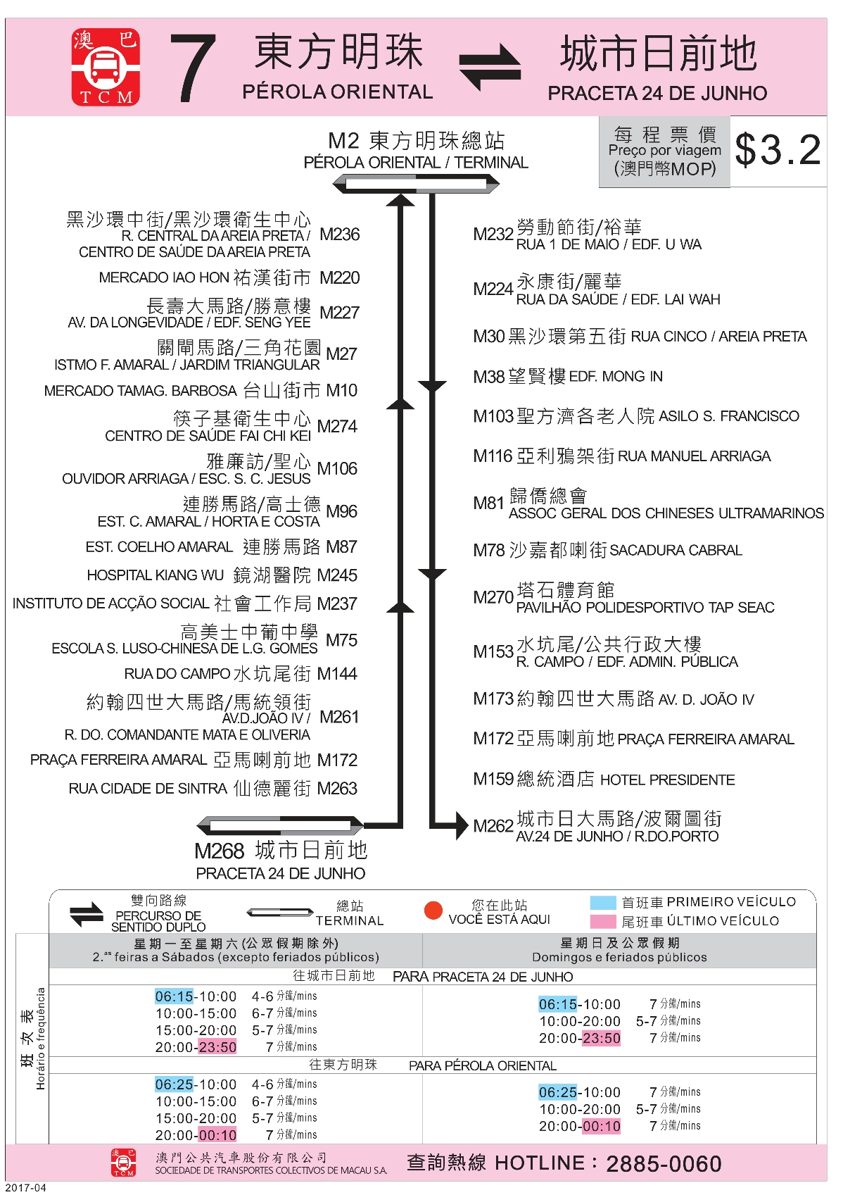 調整後,新7路線班次頻率為4至7分鐘一班,較原7路線或7A路線頻密,並將逐步改以中巴行駛,提升運力。去程由“東方明珠總站"發車,沿途停靠“勞動節街/裕華"站(新站)、“永康街/麗華"站、“黑沙環第五街"站、“望賢樓"站、“聖方濟各老人院"站、“亞利鴉架街"站、“歸僑總會"站、“沙嘉都喇街"站、“塔石體育館"站、“水坑尾/公共行政大樓"站、“約翰四世大馬路"站、“亞馬喇前地"站、“總統酒店"站,尾站為“城市日大馬路/波爾圖街"站。回程則由“城市日前地"站發車,沿途停靠“仙德麗街"站、“亞馬喇前地"站、“約翰四世大馬路/馬統領街"站、“水坑尾街"站、“高美士中葡中學"站、“社會工作局"站、“鏡湖醫院"站、“連勝馬路"站、“連勝馬路/高士德"站、“雅廉訪/聖心"站、“筷子基衛生中心"站、“台山街市"站、“關閘馬路/三角花園"站、“長壽大馬路/勝意樓"站(新站)、“祐漢街市"站、“黑沙環中街/黑沙環衛生中心"站,最後返回“東方明珠總站"。