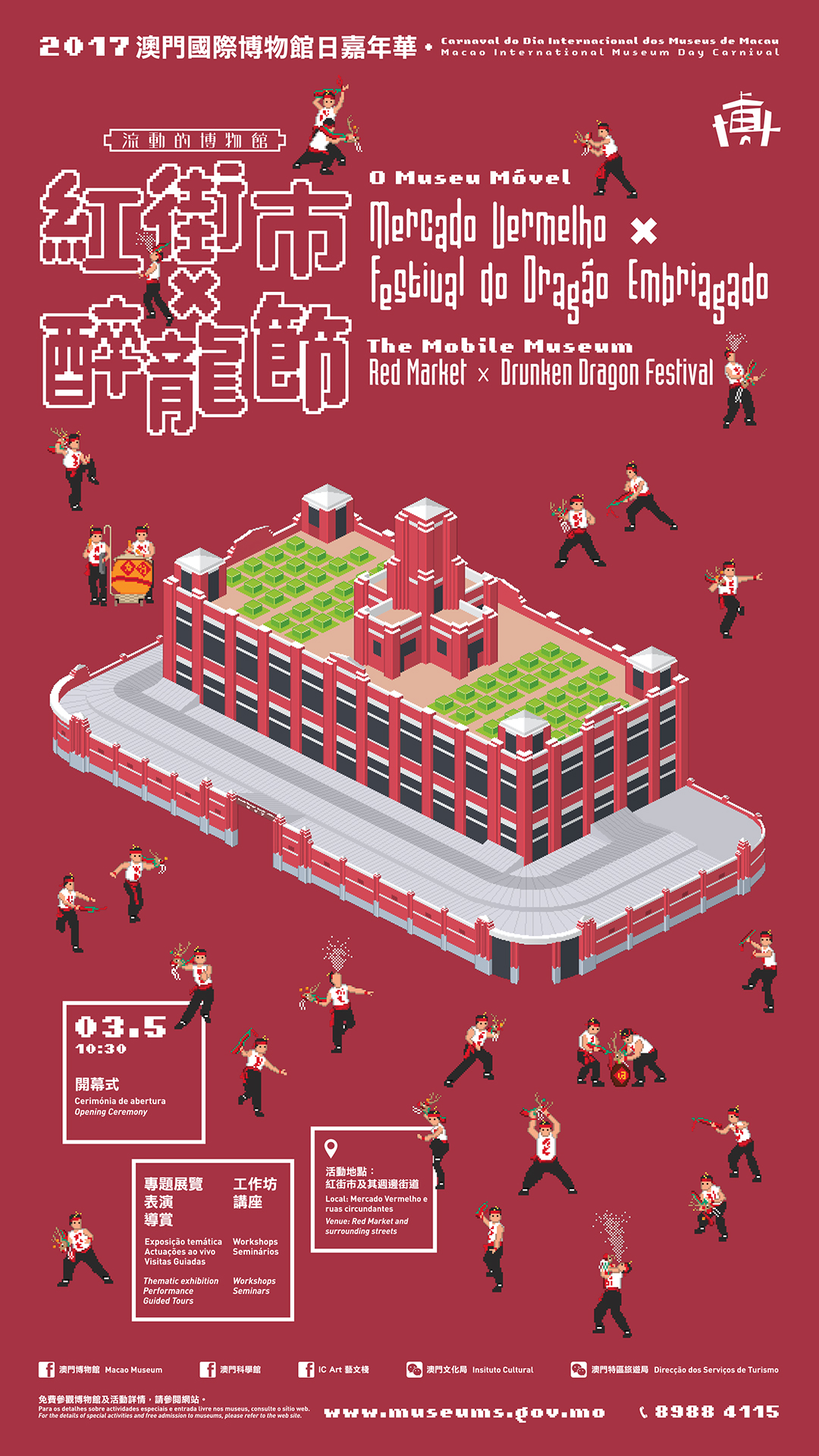 為響應今年國際博物館日,澳門十七間博物館以“流動的博物館──紅街市x醉龍節”為主題,聯合舉辦文博界年度盛事“二零一七澳門國際博物館日嘉年華",並於四月十九日(星期三)在澳門科學館會議廳舉行新聞發佈會,由各館代表介紹是屆各個精彩項目。開幕儀式將於五月三日(即農曆四月初八)上午十時三十分於紅街市舉行,將邀請廣東省文博機構、香港民政事務局及其轄下博物館代表參予,歡迎公眾參與。