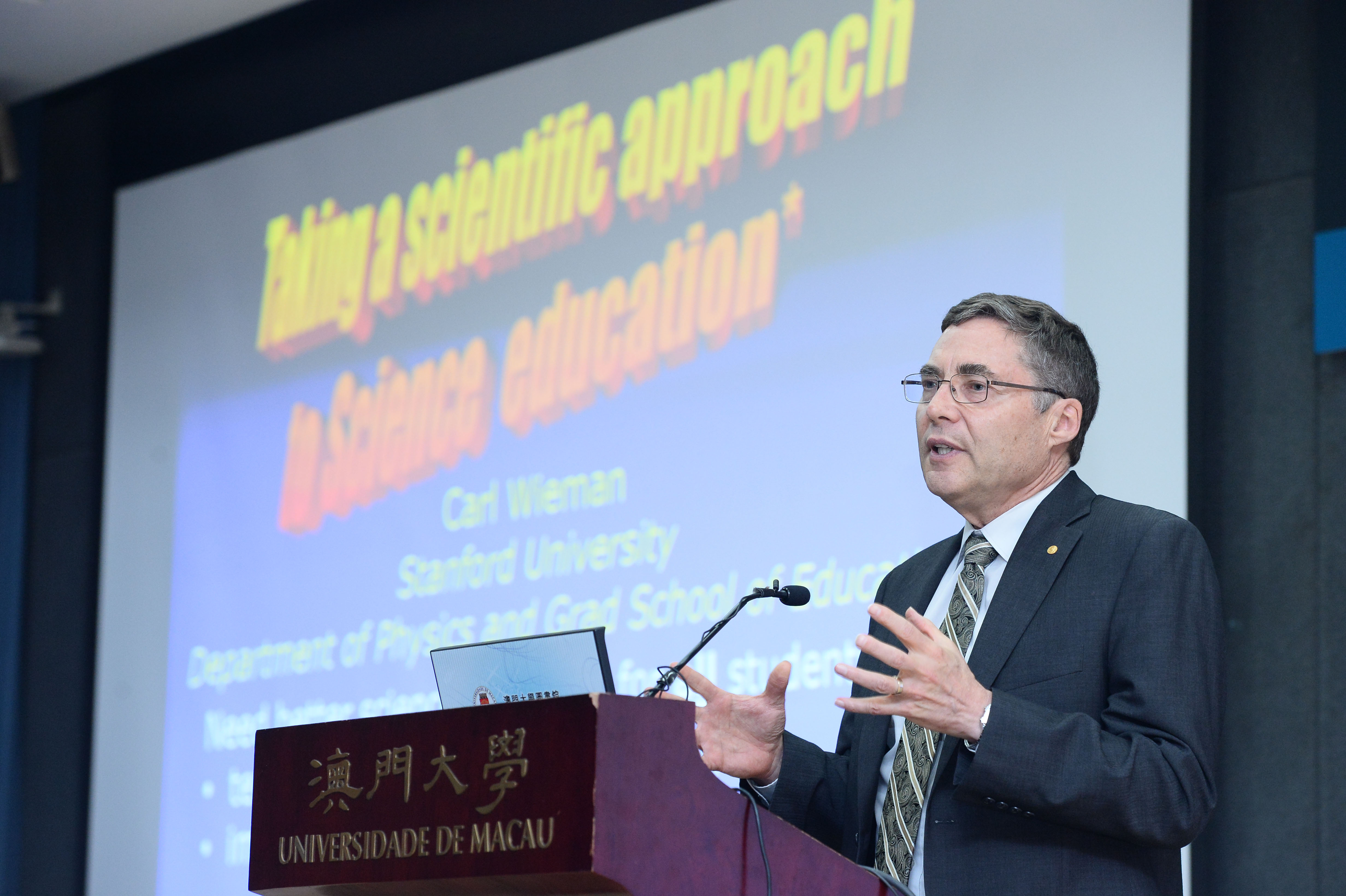 趙偉致辭時表示,威曼教授不僅具前瞻性的科學視野,開創性研究豐富,而且在過去數十年開展了不同計劃,力求改善科學教學的成效。威曼曾任白宮的科學及技術政策辦公室的科學事務副主任,現任美國國家科學院的科學教育委員會主席,也是PhET 科學模擬計劃創辦人及主席,主力改善物理、化學、數學、生物學以及地質科學的教學方法。趙偉表示,威曼在澳大開講意義深遠,因為澳門學生也很需要以科學精神求學,以科學的方法為澳門創造更好的將來。