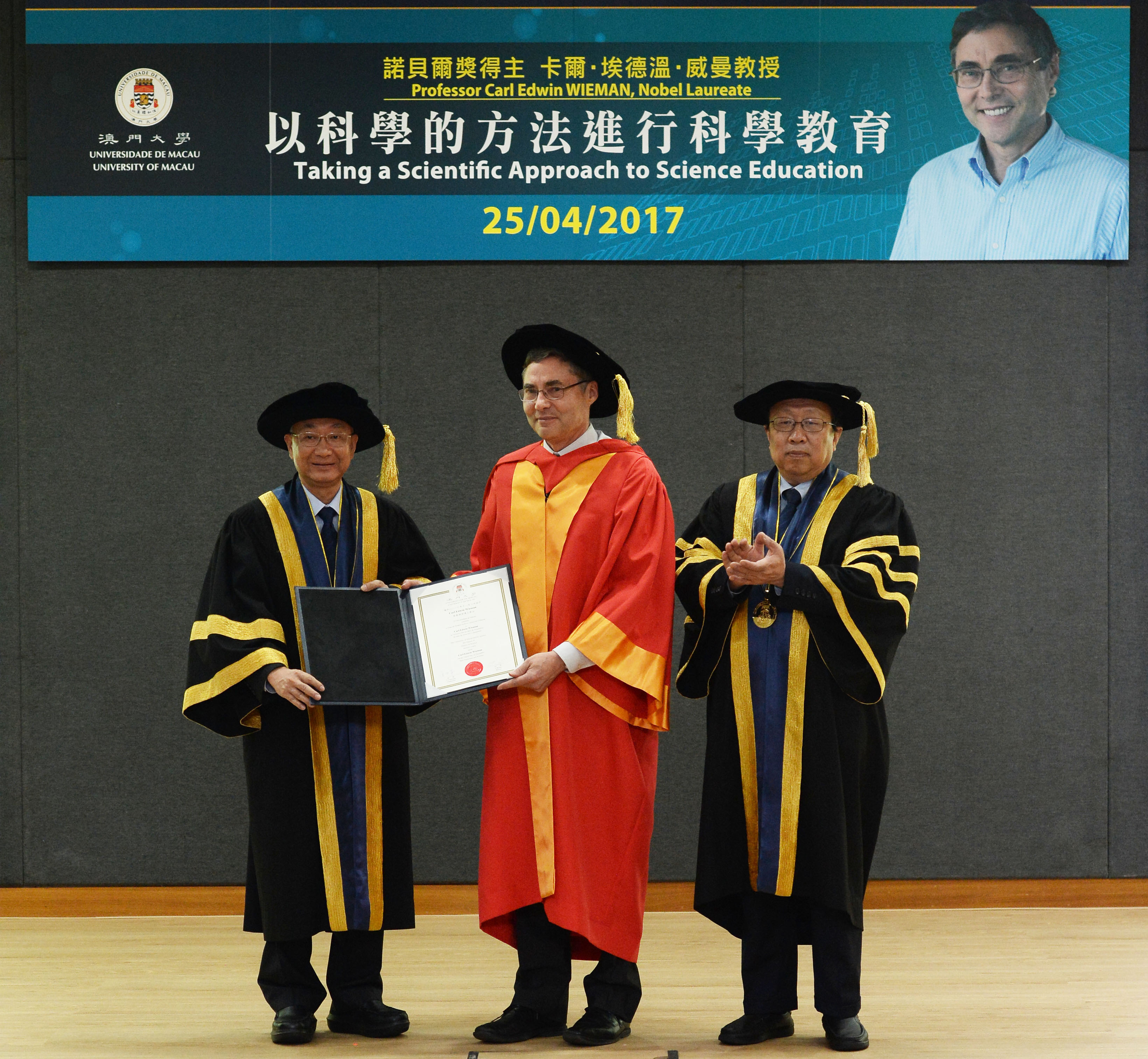澳門大學今((25)日向著名美國物理學家、諾貝爾物理學獎得主卡爾.埃德溫.威曼教授頒授榮譽理學博士學位,表彰他在愛因斯坦凝聚研究、世界科學教育的卓越貢獻。