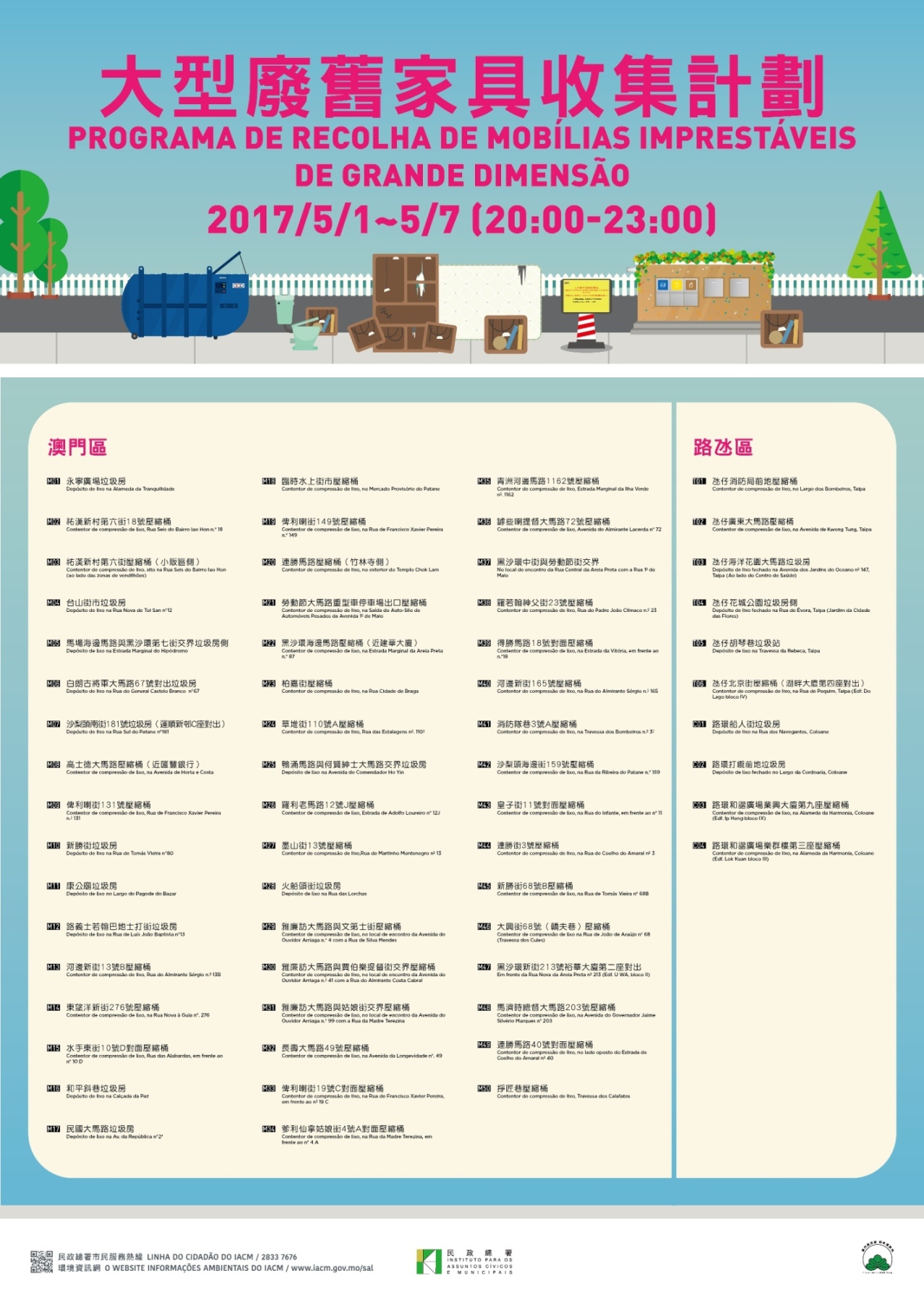 巿民可於上述期間的晚上八時至十一時,把廢舊家具放置於指定的收集站內,清潔專營公司會加派人員及車輛收集站內的廢舊家具,並於當晚全部清運處理。供市民使用的六十個臨時大型廢舊家具收集站,當中澳門半島設五十個,氹仔及路環則分別設六個及四個,具體地點可透過民署環境資訊網www.iacm.gov.mo/sal內最新消息欄目、宣傳海報及致電民署市民服務熱線2833 7676查詢。