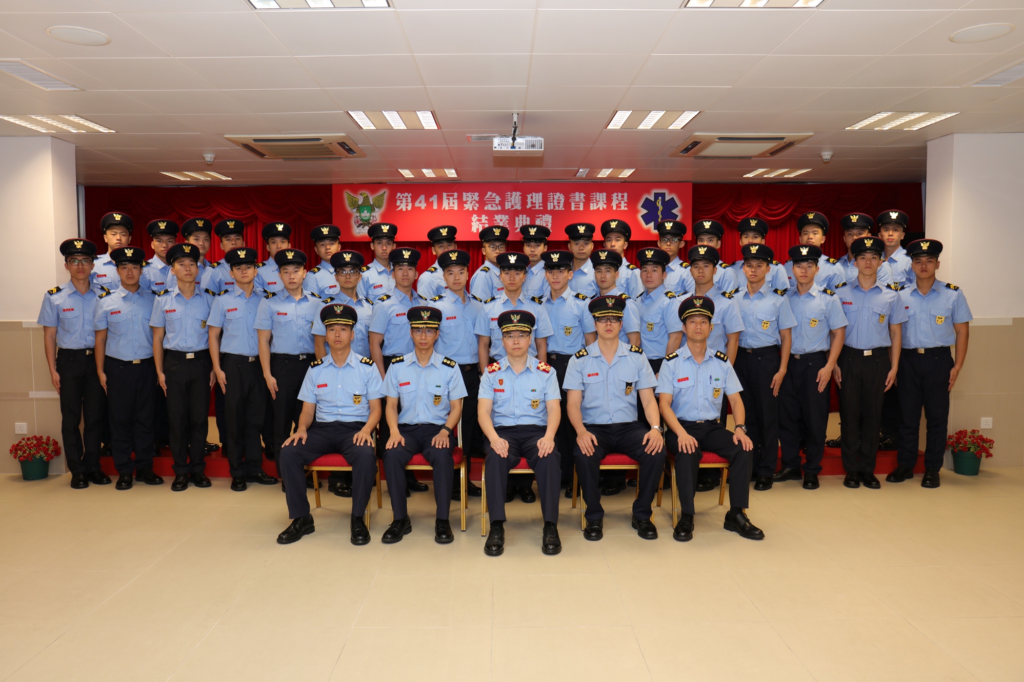 消防局開辦的第41屆緊急護理證書課程,於2017年4月28 日下午在消防局消防學校舉行了結業儀式,儀式由消防局 梁毓森 局長擔任主禮嘉賓,並致辭勉勵結業學員須時刻秉承救護員的專業操守,保持警覺,謹記救護員的職責,為市民提供優質的救護服務。