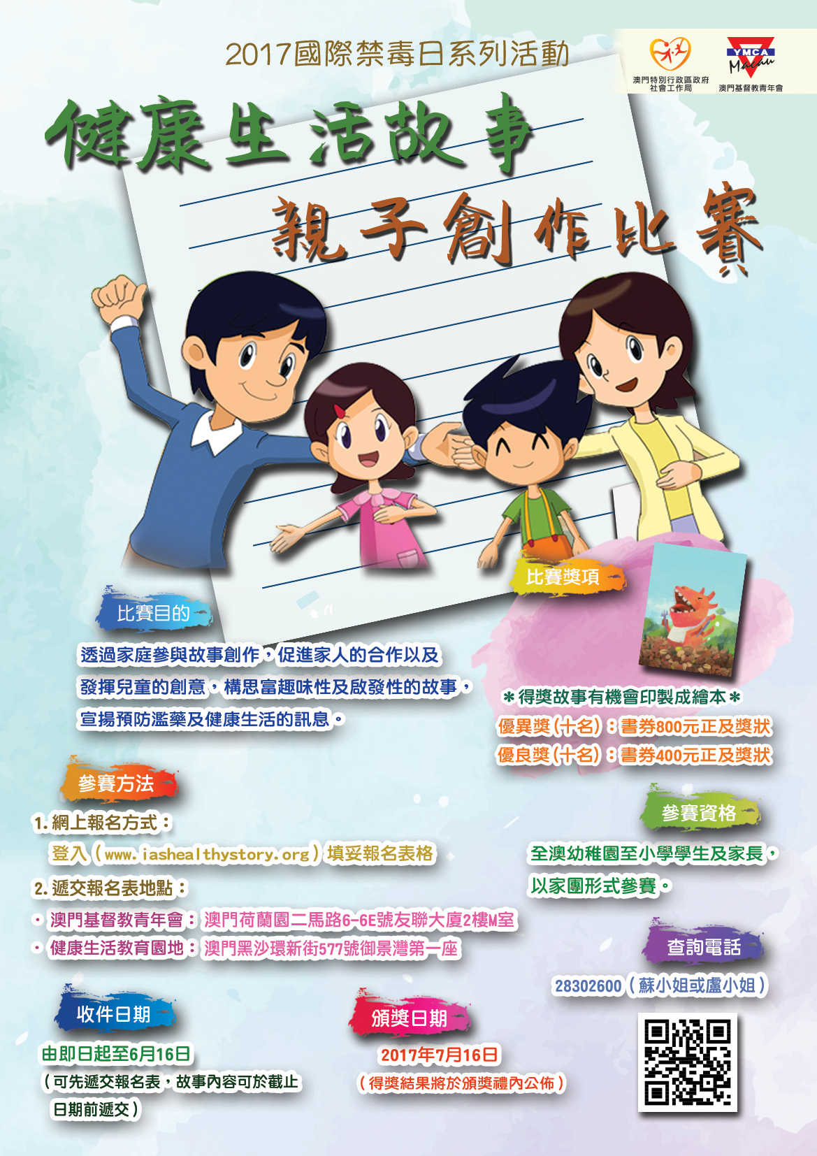 為響應聯合國訂定每年6月26日為國際禁毒日,社會工作局與澳門基督教青年會合辦“健康生活故事親子創作比賽”,歡迎本澳學生及家長踴躍參與故事創作,分享健康生活資訊。