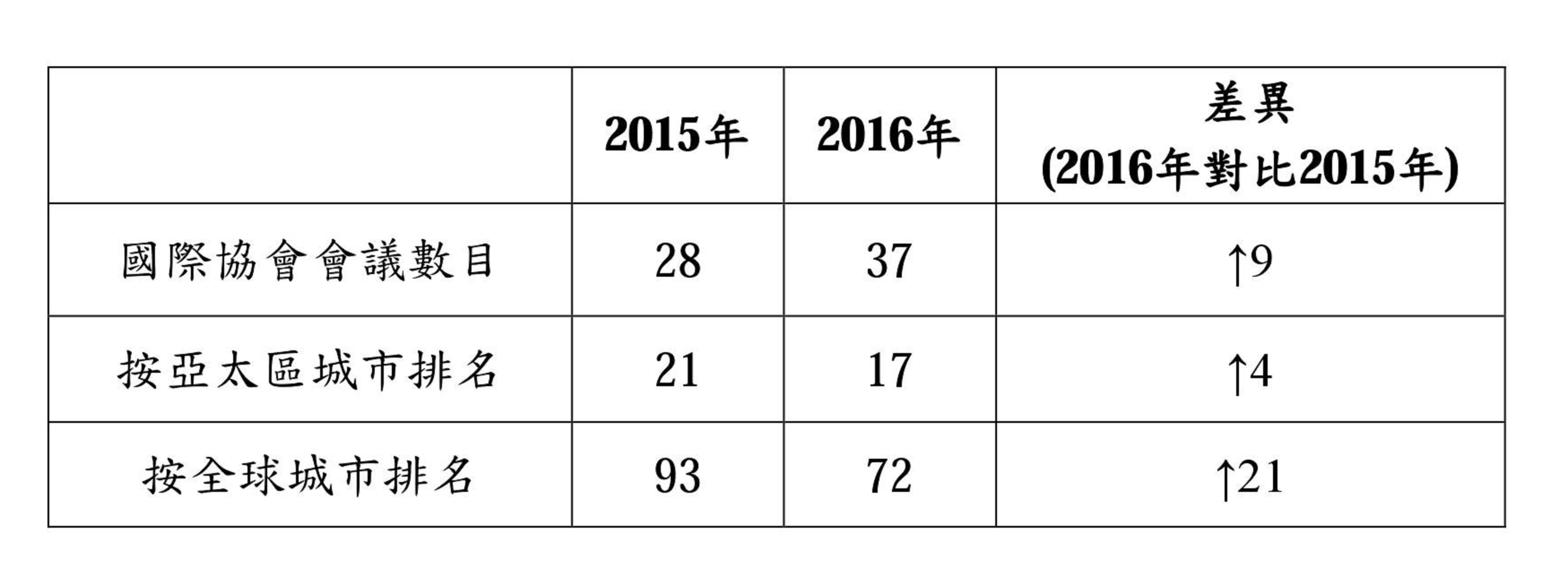 國際會議協會(ICCA)於近日發佈了《2016年國際協會會議市場年度報告》。當中澳門獲得多項評比均有上升,成績令人鼓舞,包括:全球城市排名由2015年的93名躍升至72名;亞太區域城市排名亦升至17名,同時認可了37項在澳舉行的國際協會會議活動,為歷來最多。
