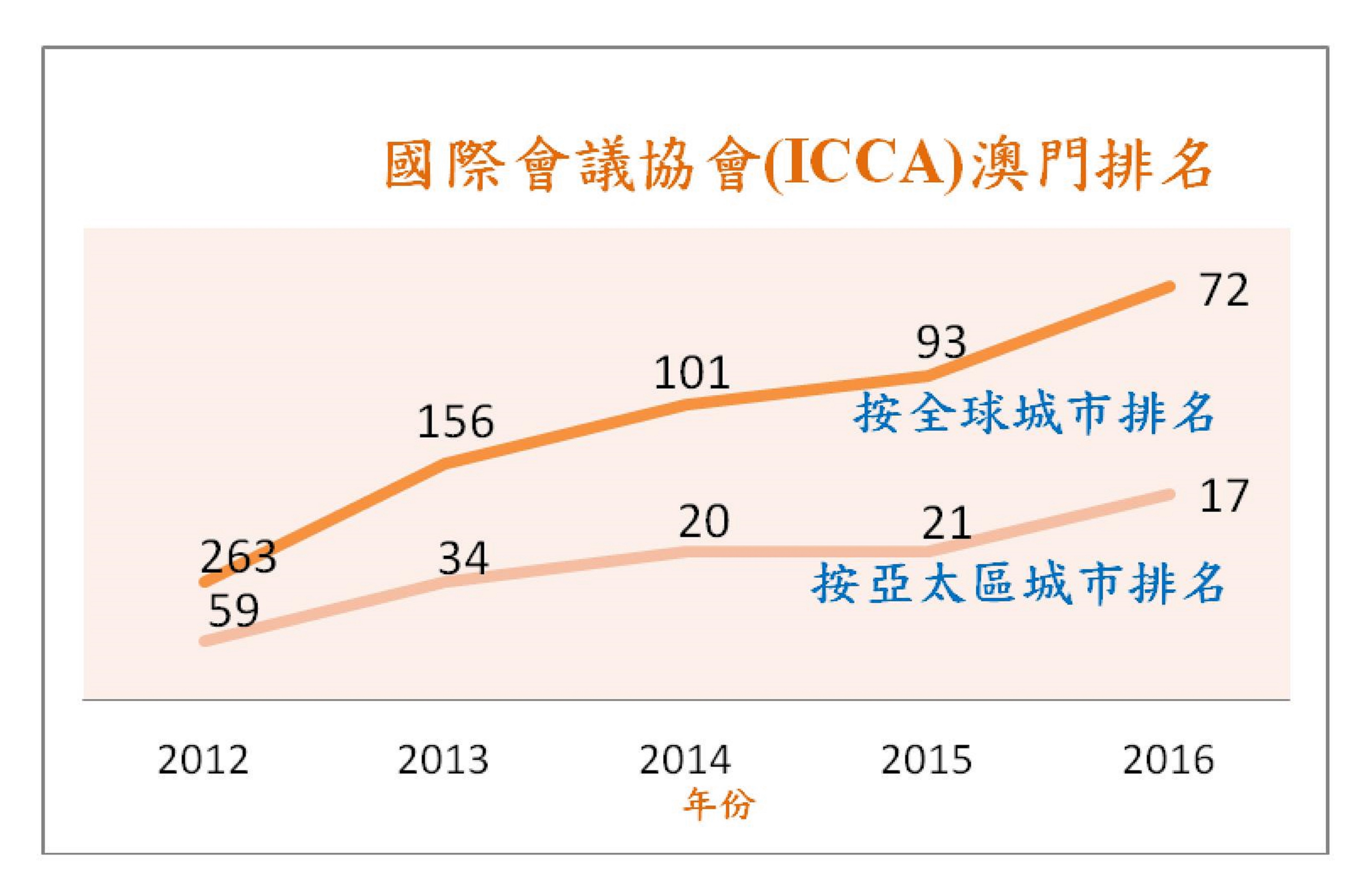 ICCA評比要求嚴格,列入統計的會議必須由國際性協會/組織定期舉辦(不含公司會議)、輪流在3個或以上國家/地區召開及參會人數不少於50人。根據最新發佈的《2016年國際協會會議市場年度報告》,共認可了37項在澳舉行的國際協會會議活動,較2015年的28項增加了9項,為歷來最多;按亞太區城市排名,澳門於2016年名列17,相比2015年上升了4名;而按全球城市排名,澳門繼2015年首度躋身全球百名後,2016年再下一城名列72,相比2015年的93名上升了21名,排名超過了澳大利亞的布里斯班、新西蘭的奧克蘭、韓國的釜山和濟州等城市,反映澳門對全球會議活動及參會代表的吸引力正逐步增加,進一步邁向以“會議為先”的會展業發展方向。隨著大型會展設施的逐漸落成,本澳會展業得以迅速發展,吸引更多國際性會議活動紛紛選址在澳門舉行。