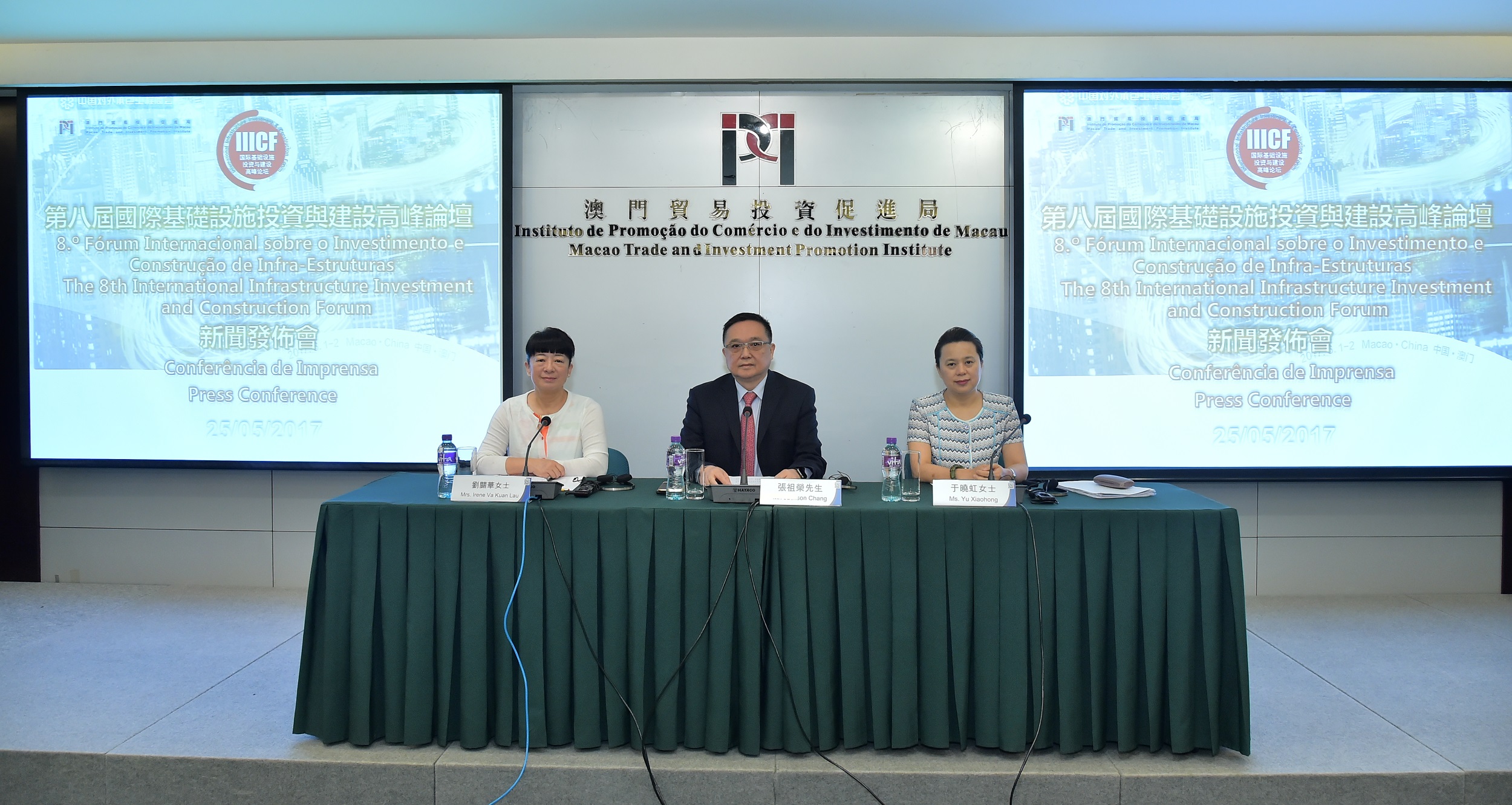 第八屆國際基建論壇新聞發佈會於5月25日在澳門舉辦。澳門貿易投資促進局主席張祖榮、執行委員劉關華及中國對外承包工程商會副會長于曉虹介紹相關籌備工作。