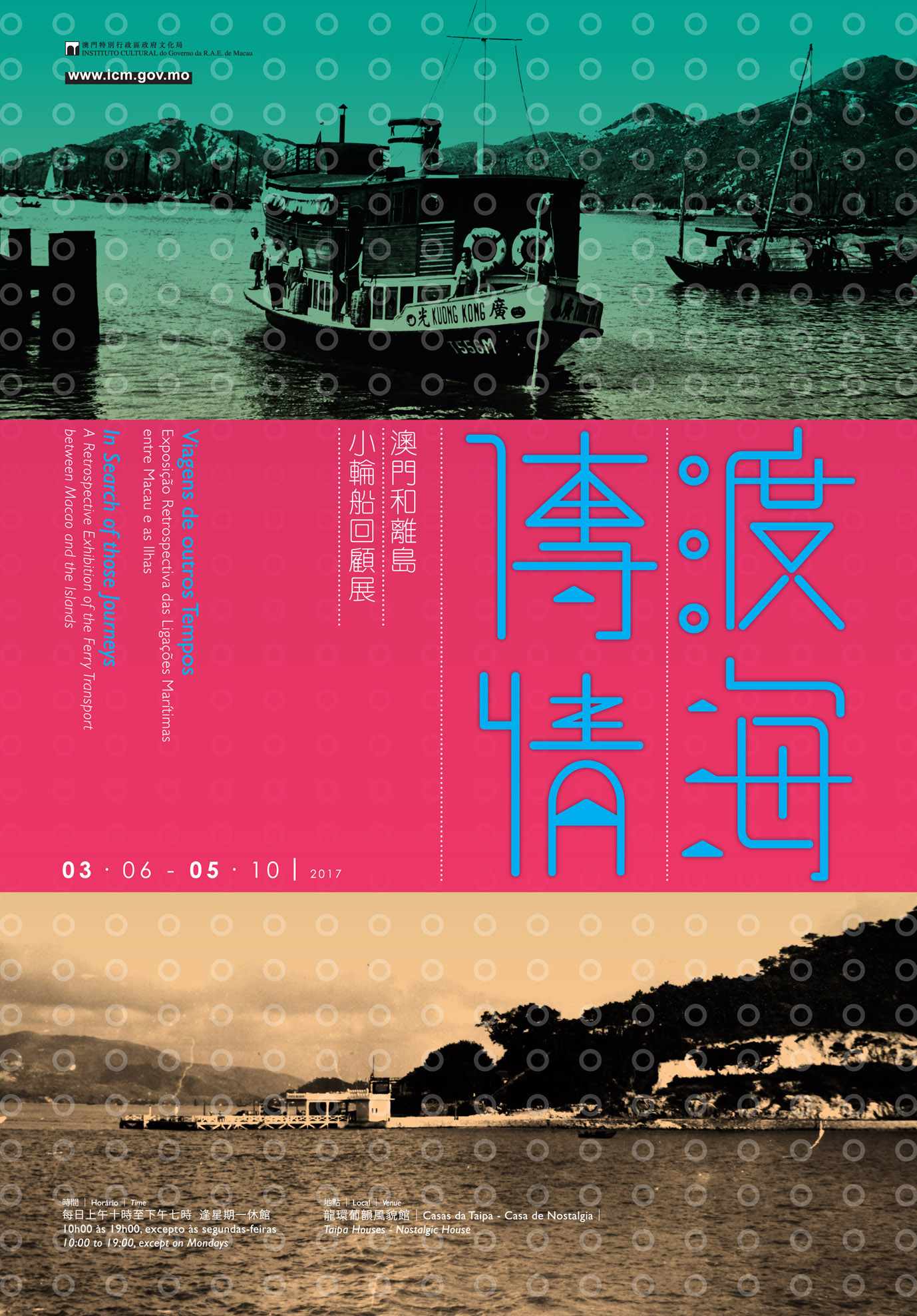 《渡海傳情─澳門和離島小輪船回顧展》將於六月三日至十月五日在龍環葡韻風貌館展出,免費入場,開放時間為上午十時至下午七時〈下午六時三十分停止入場,逢星期一休息〉。同時逢星期六下午三時至四時提供免費粵語導賞服務。展覽詳情可瀏覽文化局網站www.icm.gov.mo,查詢可於辦公時間內致電八九八八四零零零。