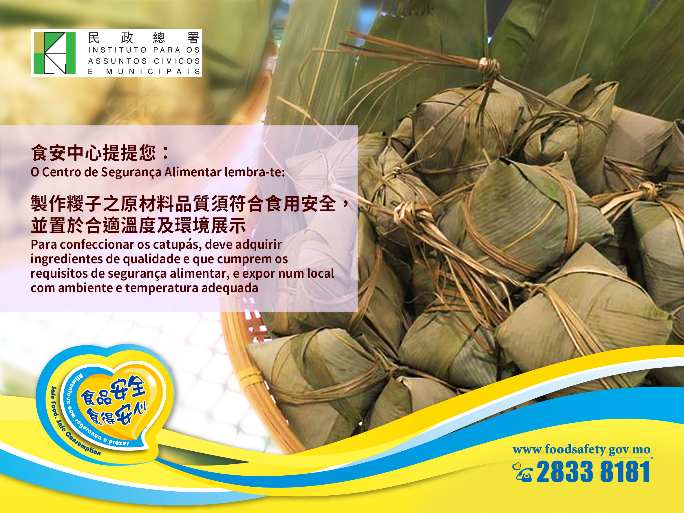 端午佳節在即,為保障市民食用安全,民政總署聯同衛生局、消費者委員會於本澳市面餐廳食肆、外賣店及超市等地點,共抽取三十件糉子樣本進行微生物學和化學檢驗,所有食品樣本的檢測結果均未見異常。