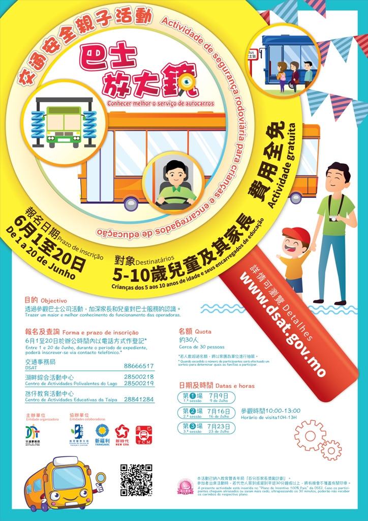 交通事務局將於7月9日(周日)起,一連三個周日舉辦「交通安全親子活動-巴士放大鏡」,安排兒童及其家長到巴士公司參觀,瞭解巴士服務日常運作。有興趣參加者,可於6月1日(周四)至20日(周二)致電交通事務局8866 6517、湖畔綜合活動中心2850 0218/2850 0219,或氹仔教育活動中心28841284登記。