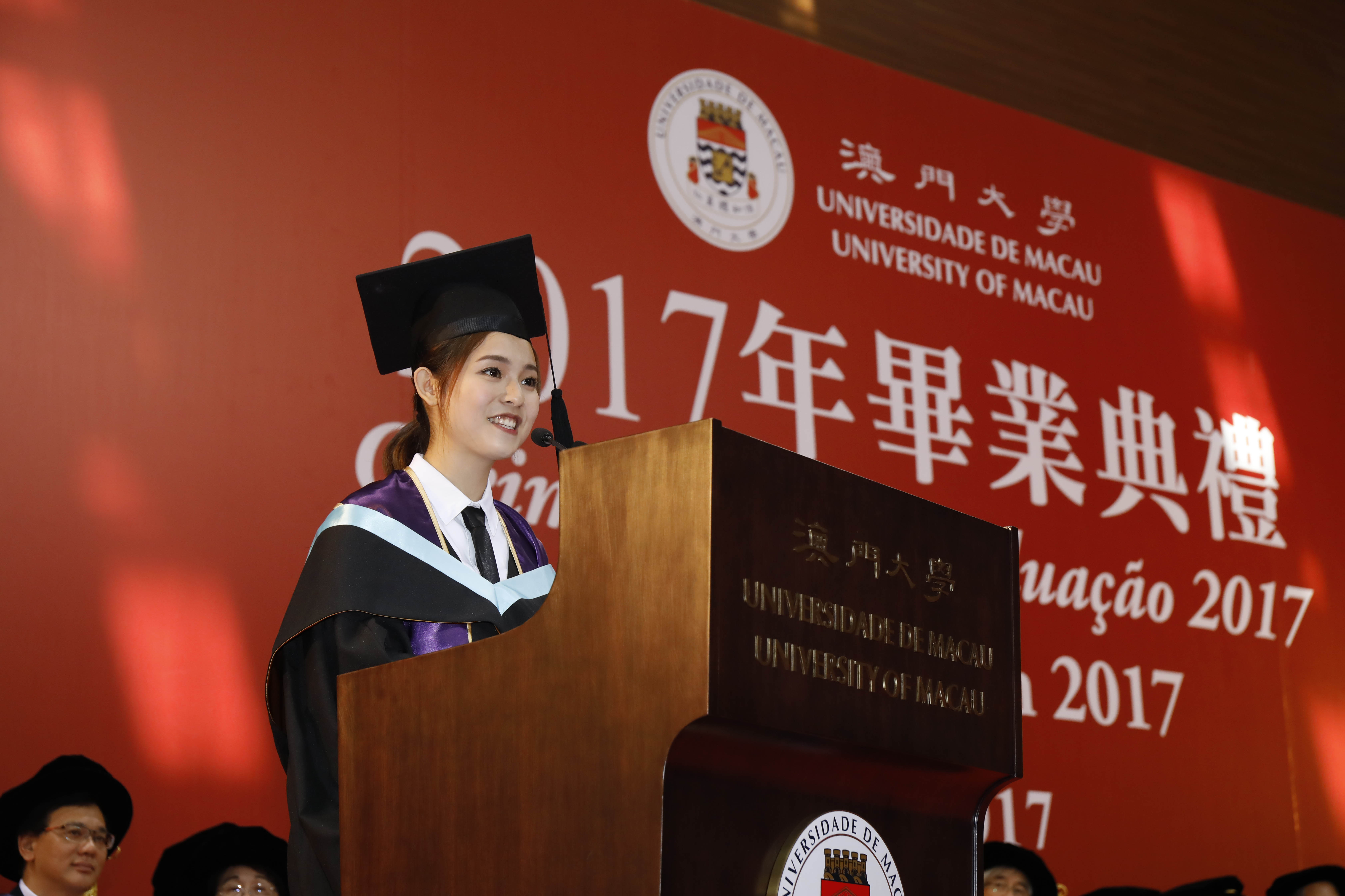 澳大畢業生代表曾曉晴回望過去四年大學生活感受良多,並指出大學生涯中最寶貴的一課是學會甚麼是謙遜。她表示,不會忘記老師的諄諄教誨,因為是他們讓自己明白“用心做事、以愛育人"道理,而她也會在教育之路上堅持這個信念。