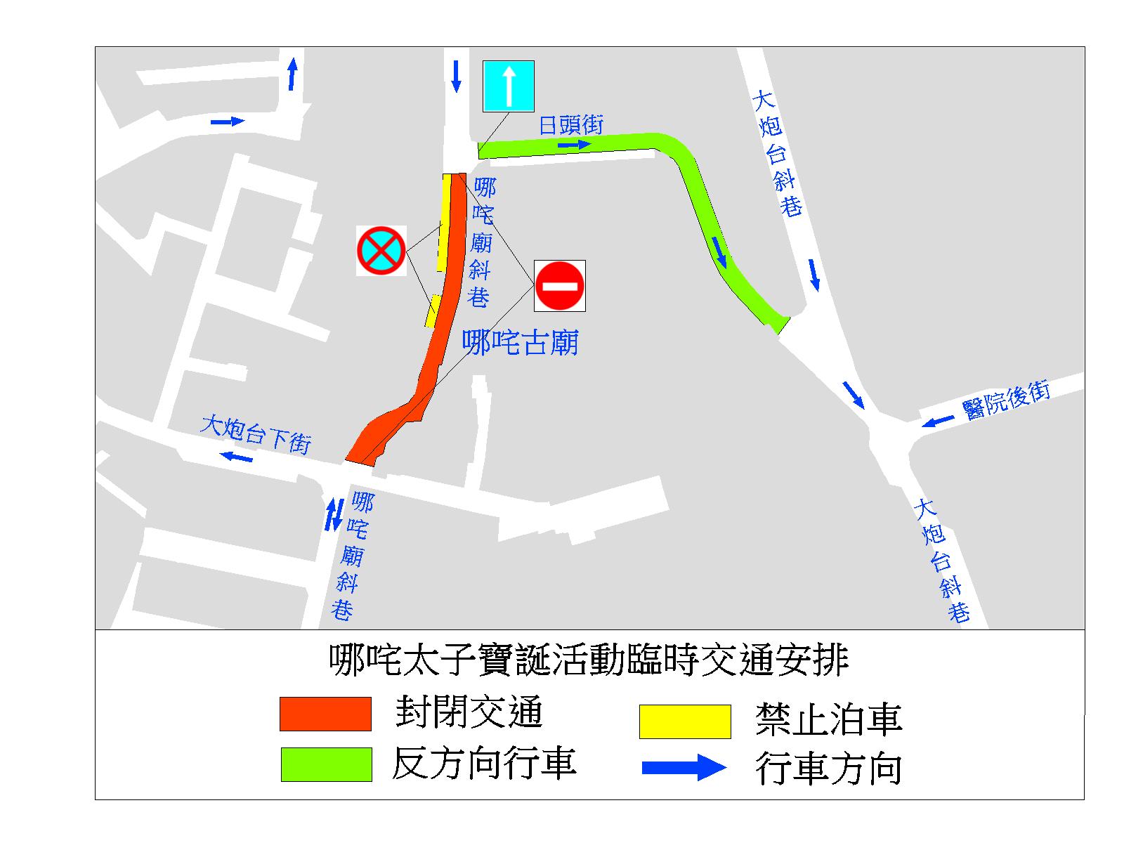 哪咤太子寶誕活動將於6月12日(周一)舉行,介乎日頭街與老饕巷之間的一段哪咤廟斜巷於6月11日(周日)下午5時至翌日(活動當日)下午2時封閉交通。同時,日頭街改作反方向行車,即車輛可由哪咤廟斜巷往大炮台斜巷方向行駛,其間禁止車輛由大炮台斜巷及醫院後街進入日頭街,駕駛者如需前往哪咤廟斜巷、大炮台下街及日頭街,可使用板樟堂街行駛。