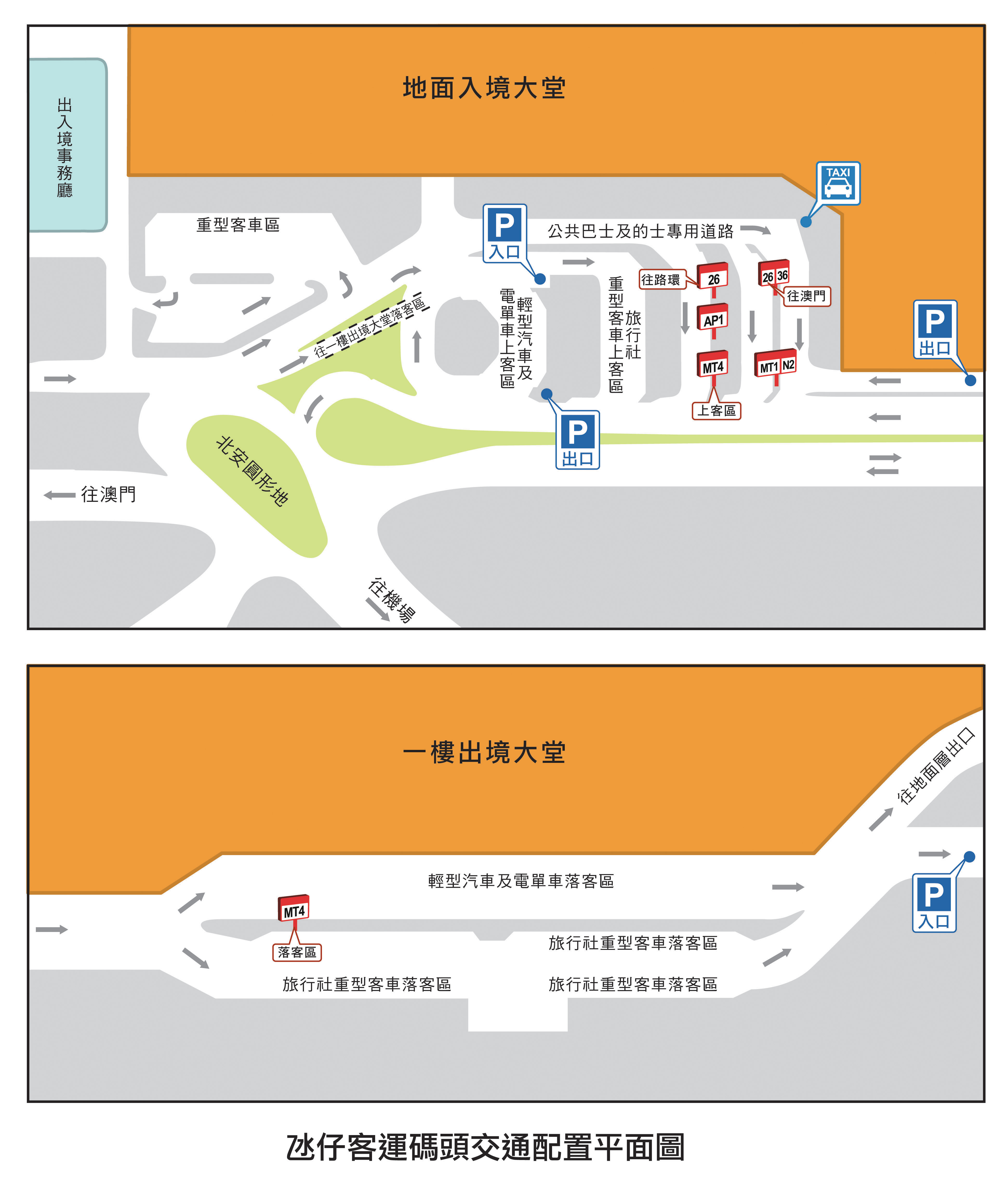 巴士方面,6月1日(周四)首班車起,26、36、AP1、MT1及N2路線在氹仔客運碼頭地面入境層巴士站上、落客,而以碼頭為總站的MT4路線在一樓出境層落客,上客則在地面入境層巴士站。