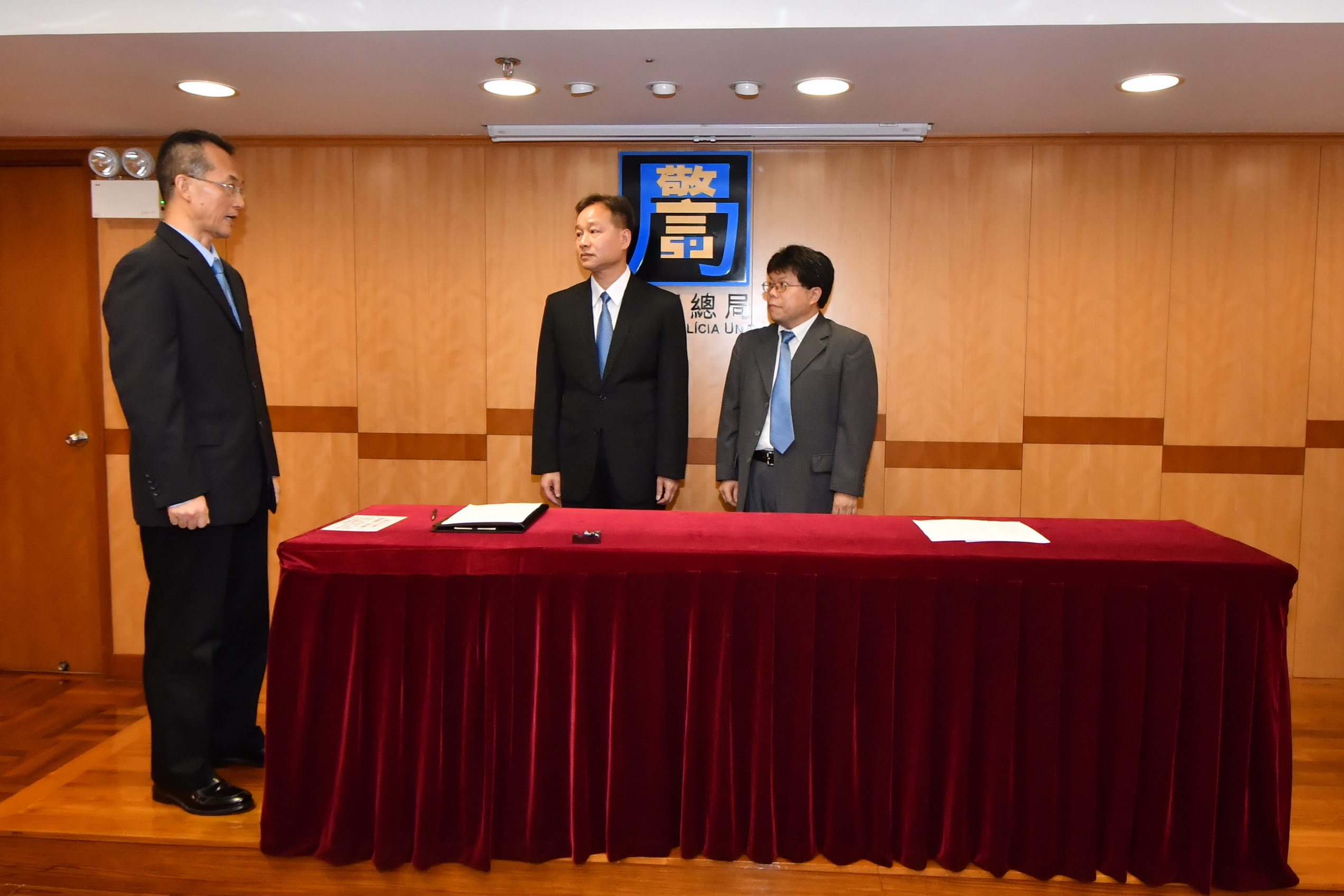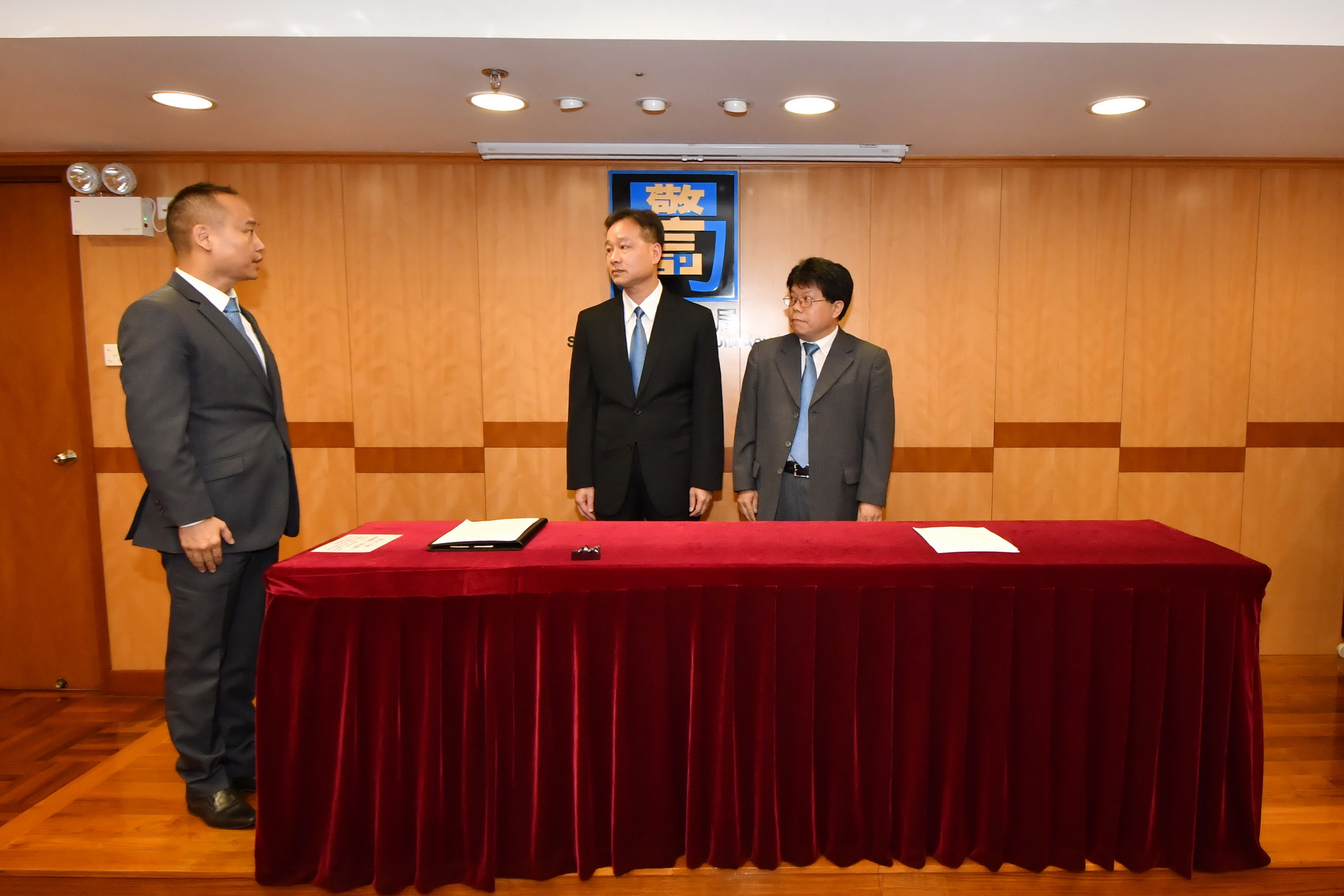 警察總局今天(二十九日)舉行一名局長助理—吳錦華,以及兩名處長—鄺耀漢及董志明的就職儀式。儀式由警察總局局長馬耀權主禮及監誓,出席的還有現任局長助理羅偉業和梅山明、局長辦公室協調員趙汝民以及各部門主管及同事。