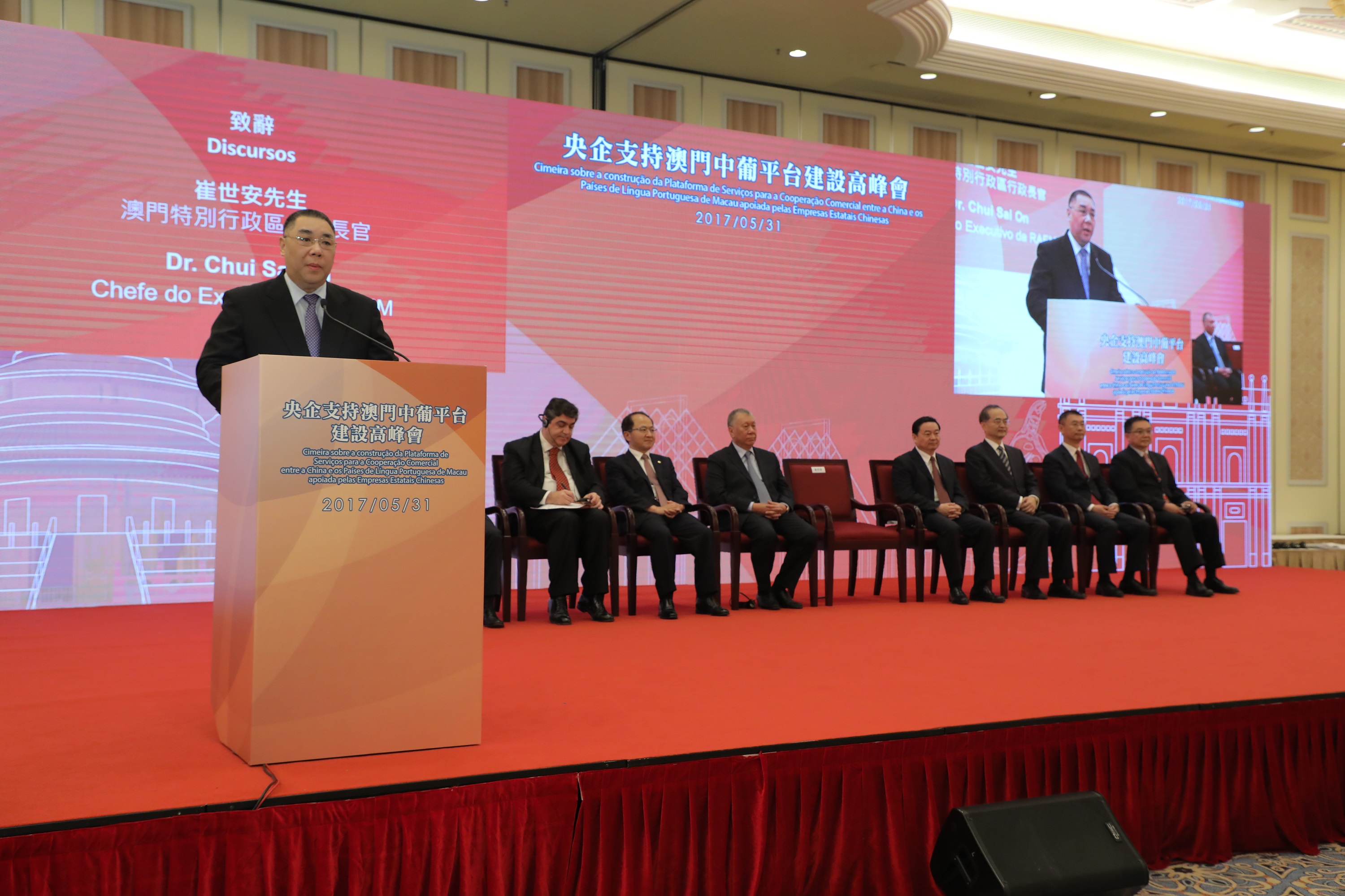 “央企支持澳門中葡平台建設高峰會”於今(31)日在澳門舉行,是次高峰會由澳門特別行政區政府主辦、國務院國有資產監督管理委員會及中央人民政府駐澳門特別行政區聯絡辦公室作為支持單位,澳門特別行政區政府經濟財政司承辦,澳門貿易投資促進局協辦。