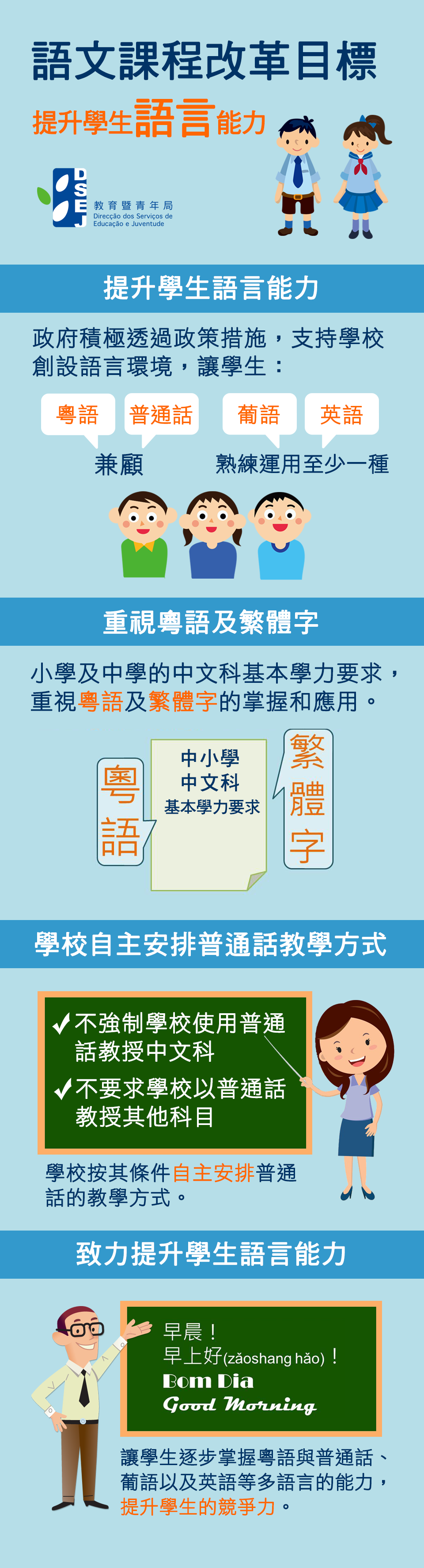 教青局將一如既往地積極透過政策措施,支持學校創設語言環境,讓學生粵語與普通話兼顧,並能熟練運用葡語或英語至少一種外語的能力,以提升競爭力。